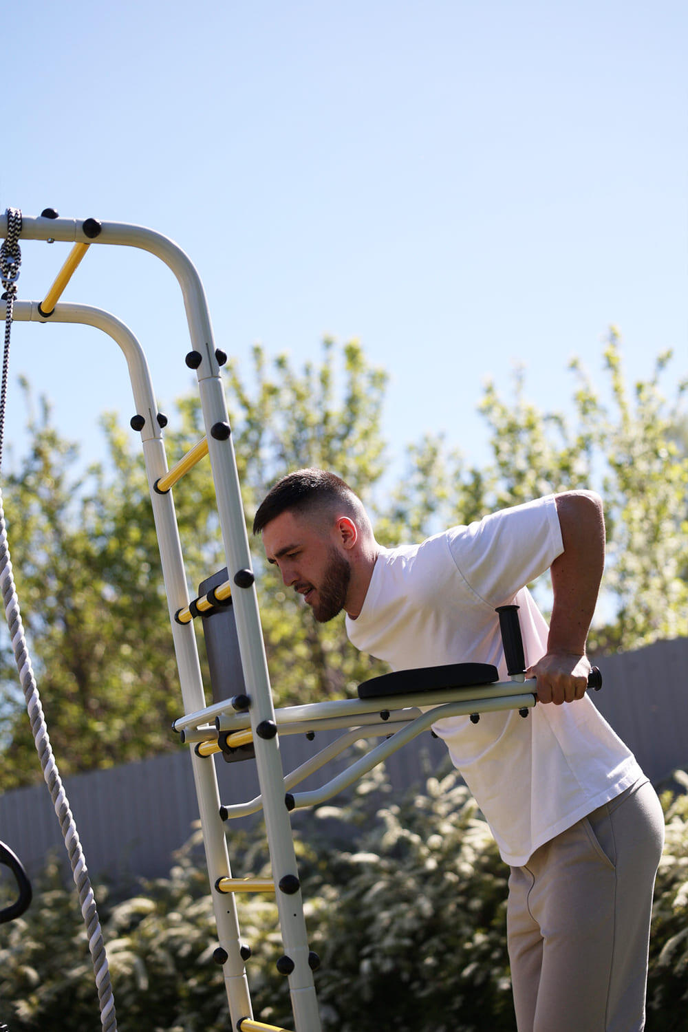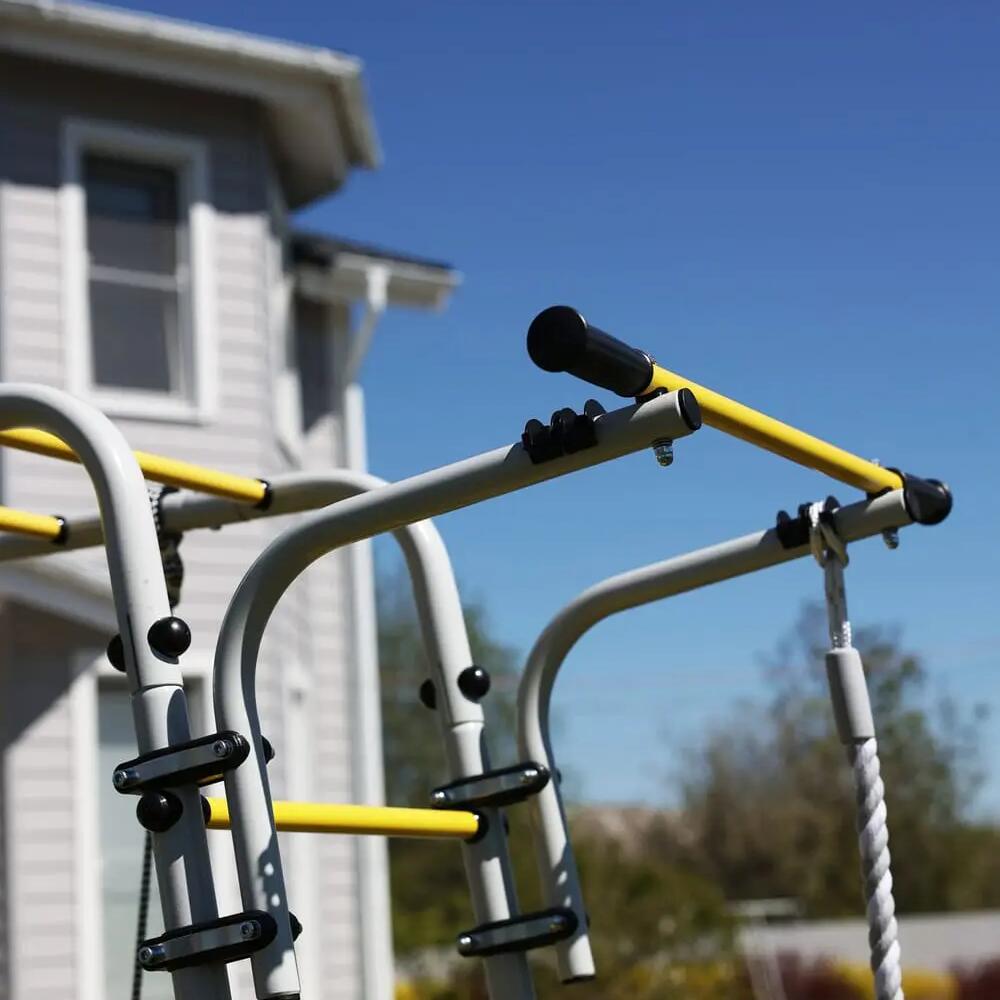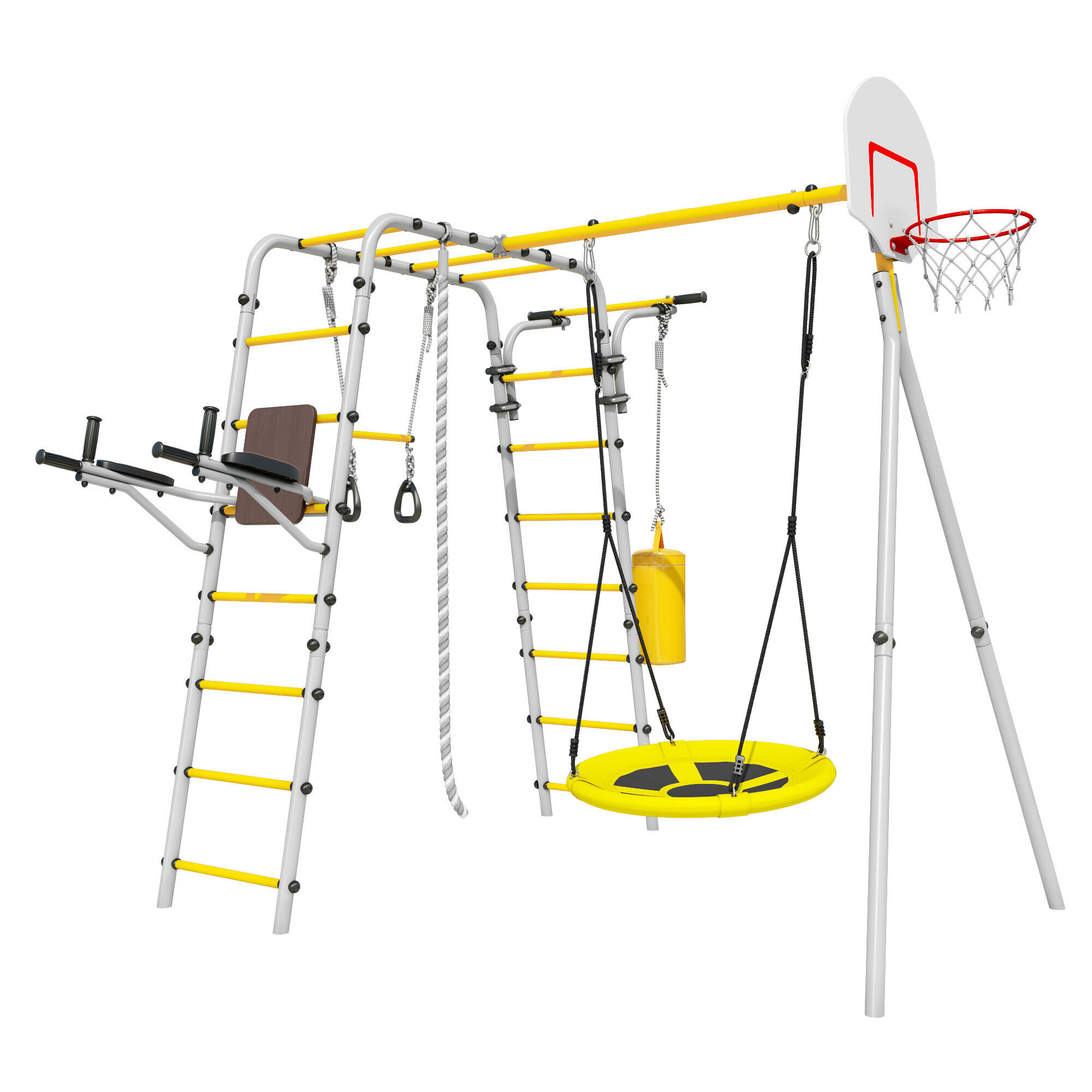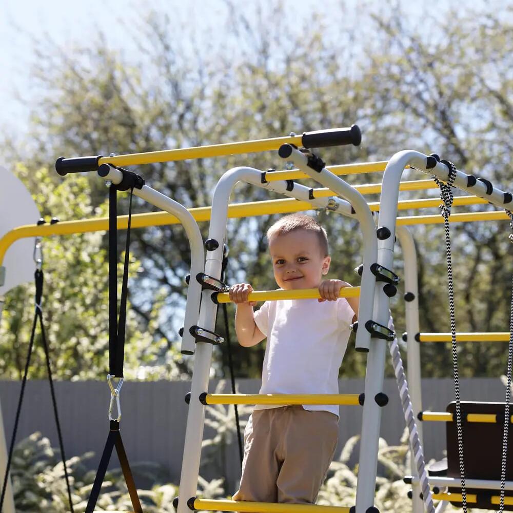 The horizontal ladder challenges endurance and arm strength as children move across while hanging from their hands. The gymnastics rope helps build muscles and improve motor skills. The set also includes gym rings with a trapeze bar for acrobatics, a basketball hoop for active play, and a punching bag for extra fun and energy release.