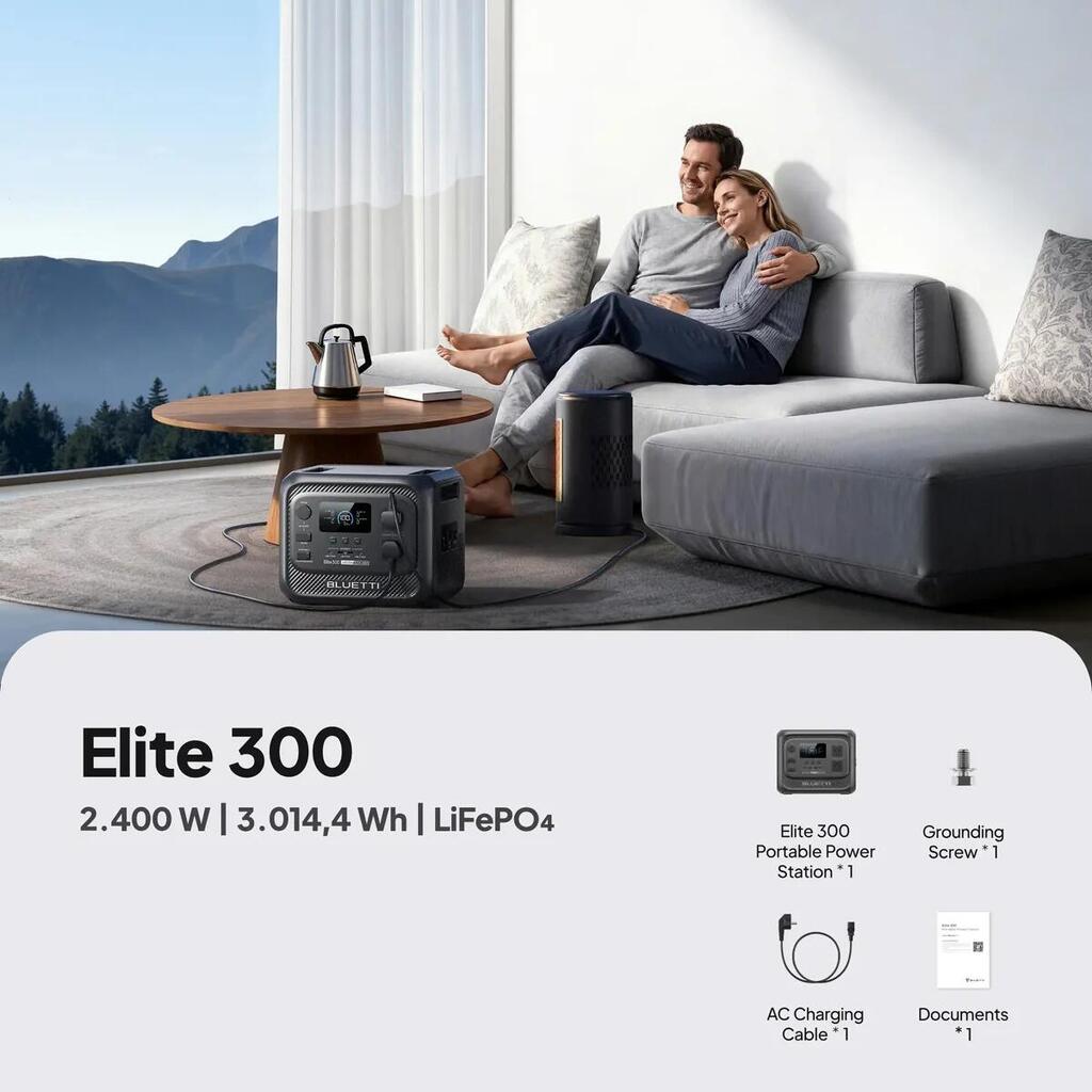 BLUETTI Elite 300 delivers 3014.4Wh capacity—nearly 1kWh more than typical 2kWh models—without bulky expansion batteries. It’s ideal for short RV trips, family camping, and reliable home backup power when you need just the right amount of energy.