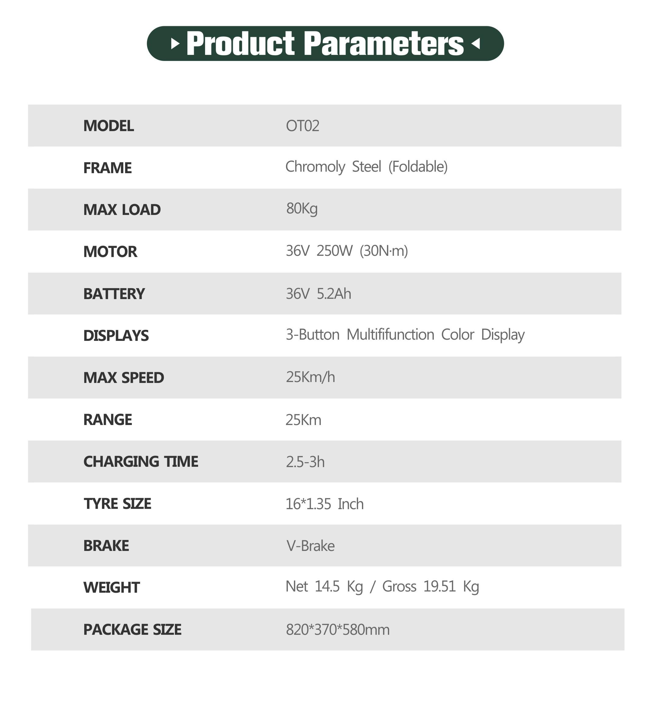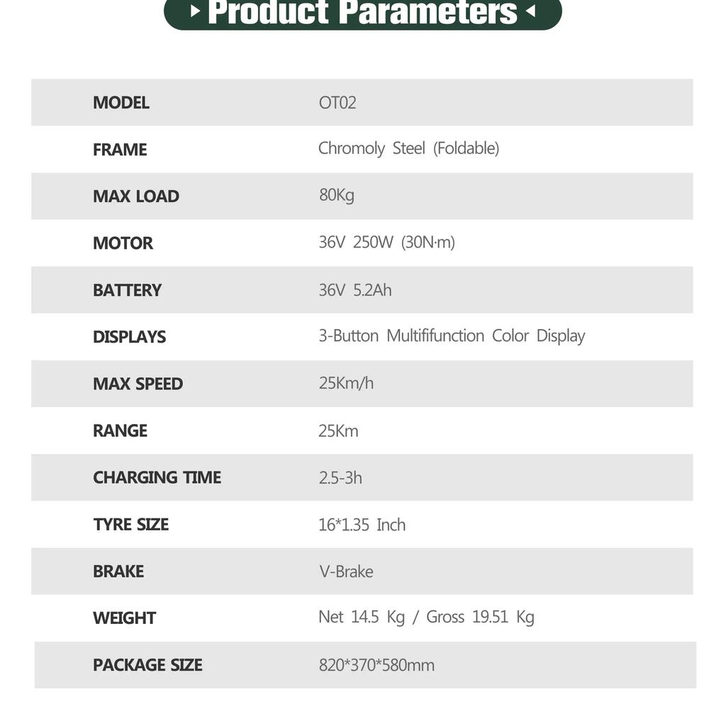 The ONESPORT OT02 is engineered for convenient urban mobility through its 250W hub motor and efficient torque sensing system. The lightweight chromoly steel frame and compact 16-inch wheels contribute to agile handling and easy portability. With a focus on practical commuting needs, the bike offers a 25km assist range and can handle slopes up to 30°, making it suitable for riders between 130-190cm tall seeking a simple, portable transportation solution.