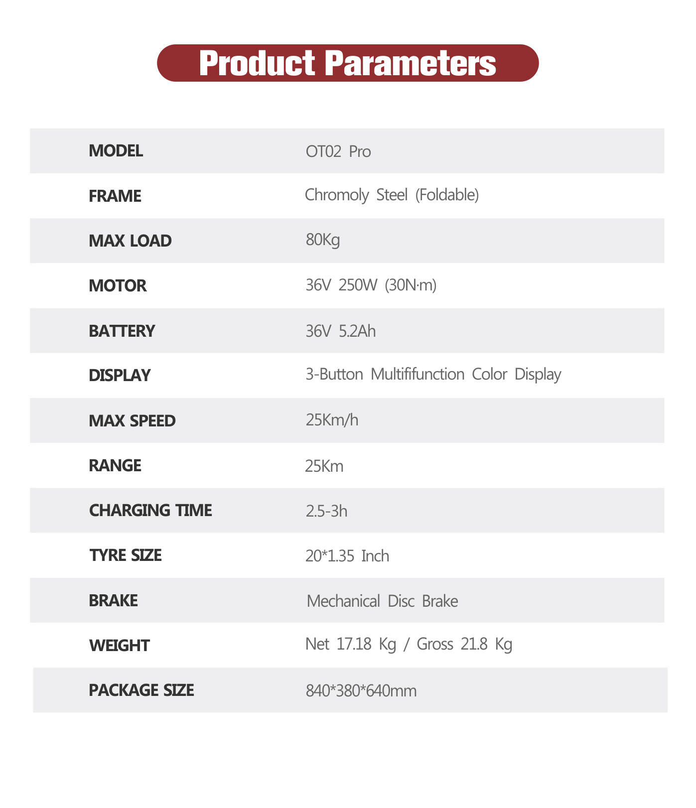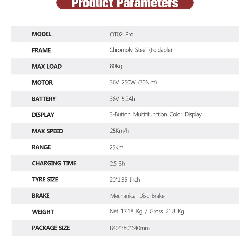 The OT02 PRO features a simple three-step folding mechanism that allows it to compact quickly for storage in tight spaces—ideal for apartments, car trunks, or taking on public transport. Once folded, the bike can be easily carried thanks to its manageable size and weight, making it a practical solution for mixed-mode commuting.
