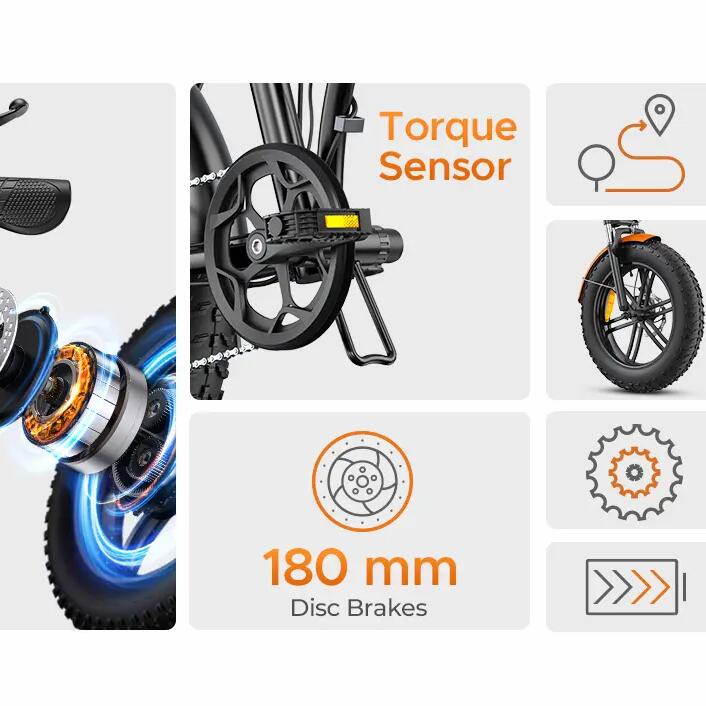 250W motor with 55Nm torque & Boost button Up to 120km range in PAS 1 mode 20x4.0-inch all-terrain fat tires Torque sensor for smooth pedal assist 180mm fro