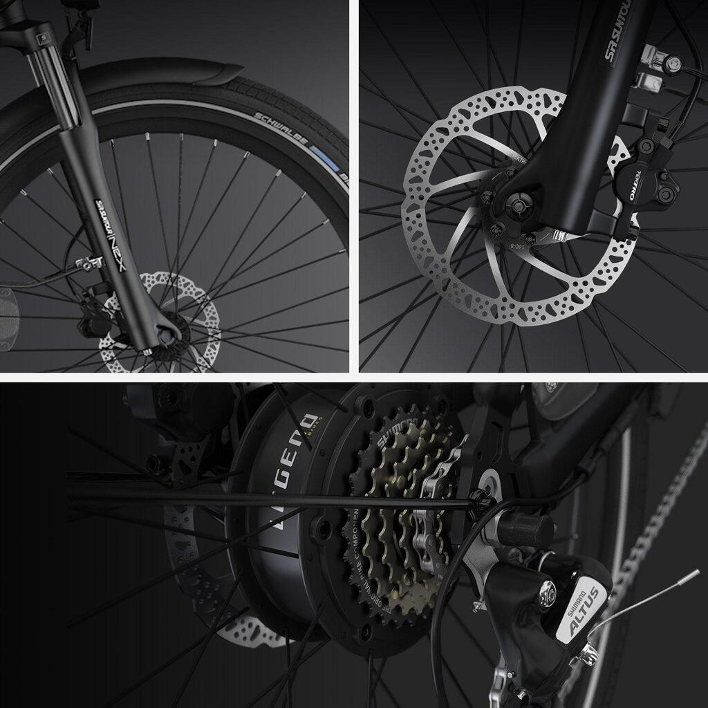 Sturdy and elegant electric urban bike. Designed for heavy use, it comes with front suspension, hydraulic brakes, and a rack. Smart eBike with a connected APP.
