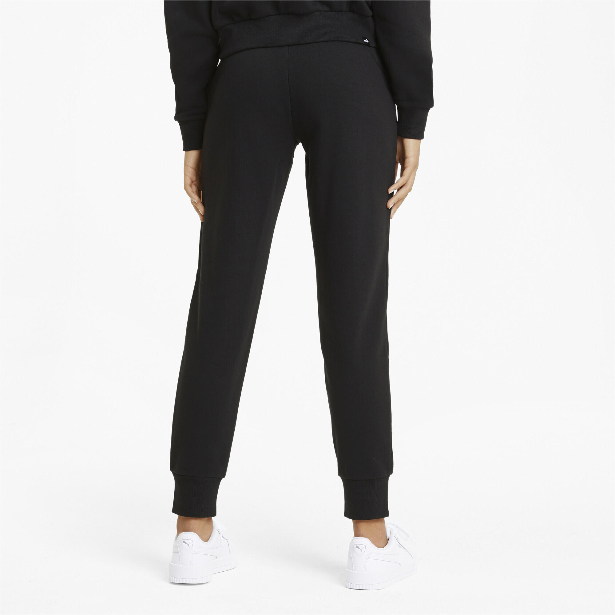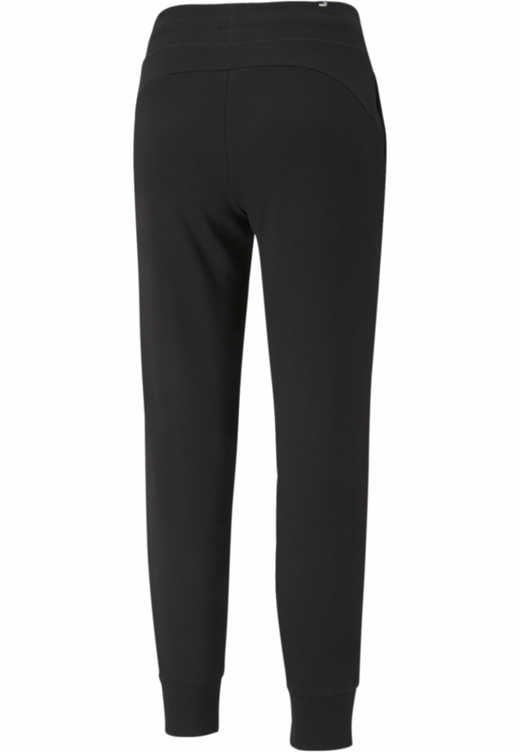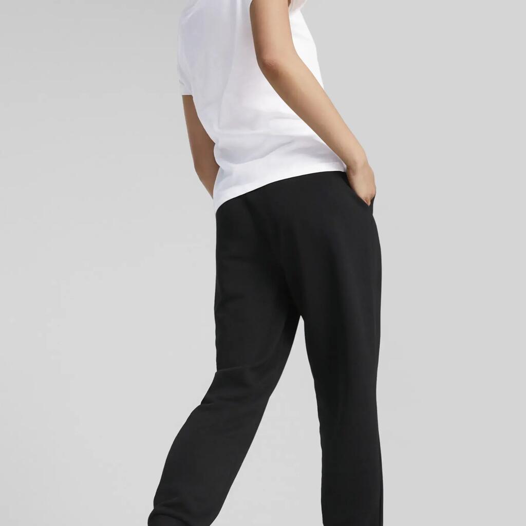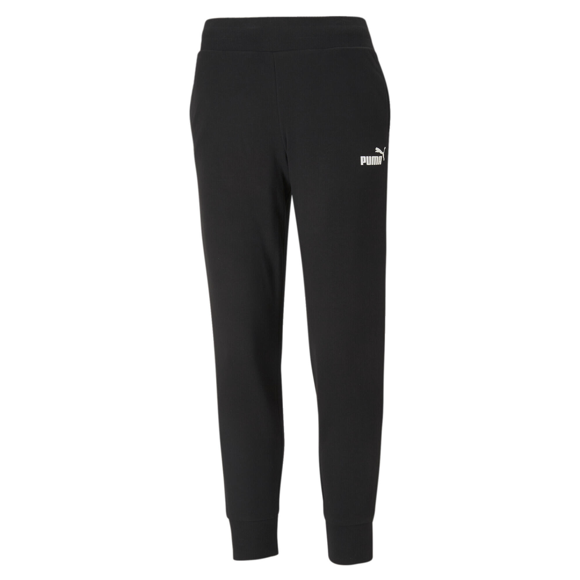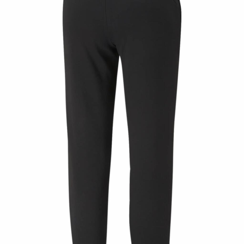 PUMA Essential Pants Black 32% Recycled Polyester 68% Cotton regular fit side welt pockets ribbed waistband with internal drawcord ribbed leg hem PUMA Cat logo on left side and back of waist