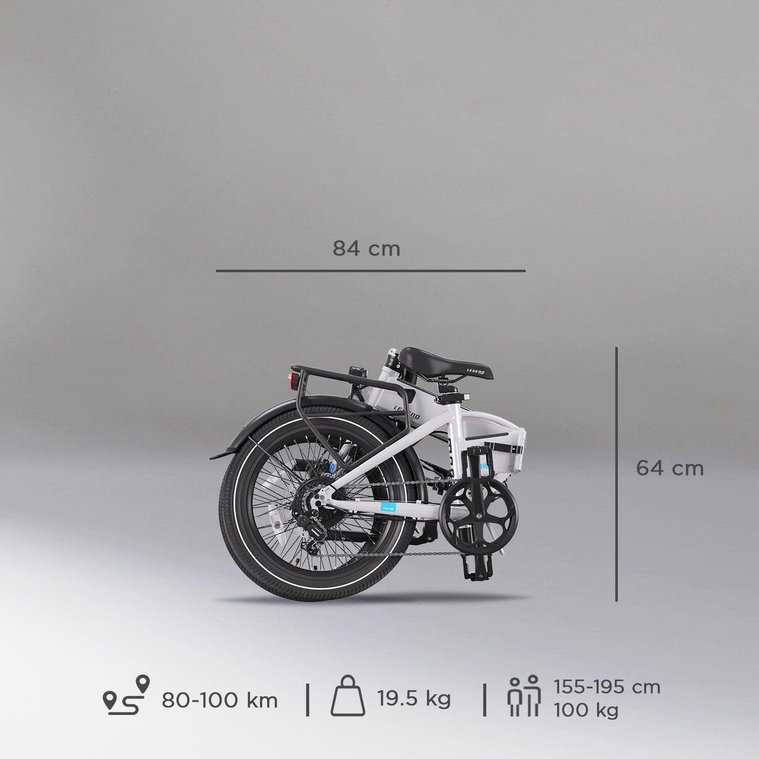 **COMFORTABLE AND SAFE** Experience superior comfort and safety with an ergonomic saddle, Shimano Tourney 6-speed derailleur, hydraulic disc brakes, and 20ā³ tyres offering a "full suspension" feel for a pleasant and functional ride, even as a folding bike.