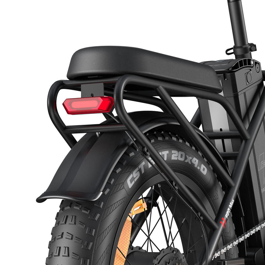 Designed for seamless integration into your lifestyle, the F20 Max features a collapsible frame, handlebars, and pedals. This folding electric bike for commuting and travel, easily fitting in car trunks or RVs for weekend getaways. Beyond portability, it arrives ready for utility with a pre-installed front rack, rear footrests, and fenders, making it perfect for running errands or carrying gear.