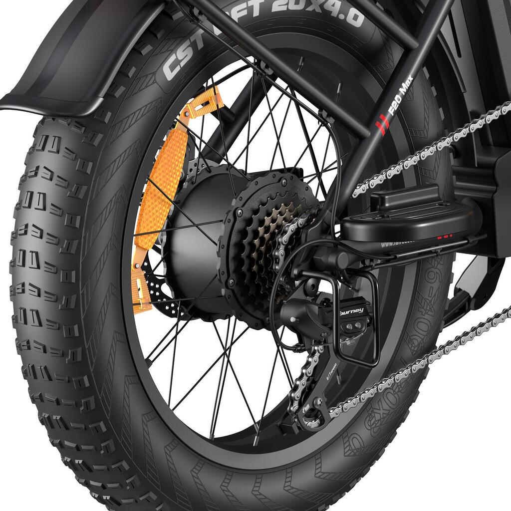 Experience unmatched stability and control with the geared hub motor (54N.m torque) paired with CST 20*4.0-inch air tires. As a rugged fat tire electric bike for off road, it excels on challenging surfaces like sand, snow, mud, and gravel. The rear-drive system provides superior traction and climbing capabilities up to a 25° gradient, empowering you to confidently explore paths less traveled.
