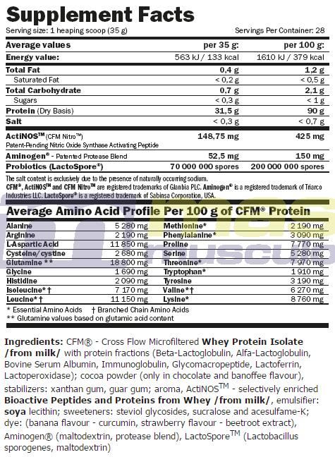 CFM Nitro Protein Isolate from MuscleCore Amix is a highly effective dietary supplement suitable for everyone, especially athletes with a high level of exercise routine. It contains Aminoge, a matrix of digestive enzymes that provides excellent absorption capacity, and Lactospore, a bacteria that promotes a healthy gut flora, making it suitable for any diet. CFM Nitro Protein Isolate from MuscleCore Amix is lactose-free, fat-free, and sugar-free, as it uses stevia and sucralose as sweeteners, making it completely free of aspartame.