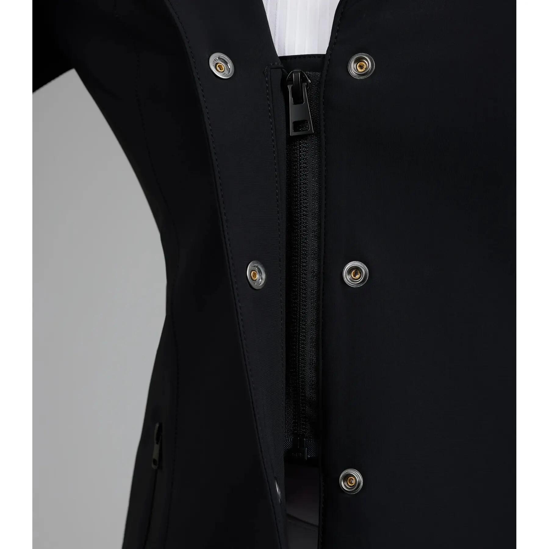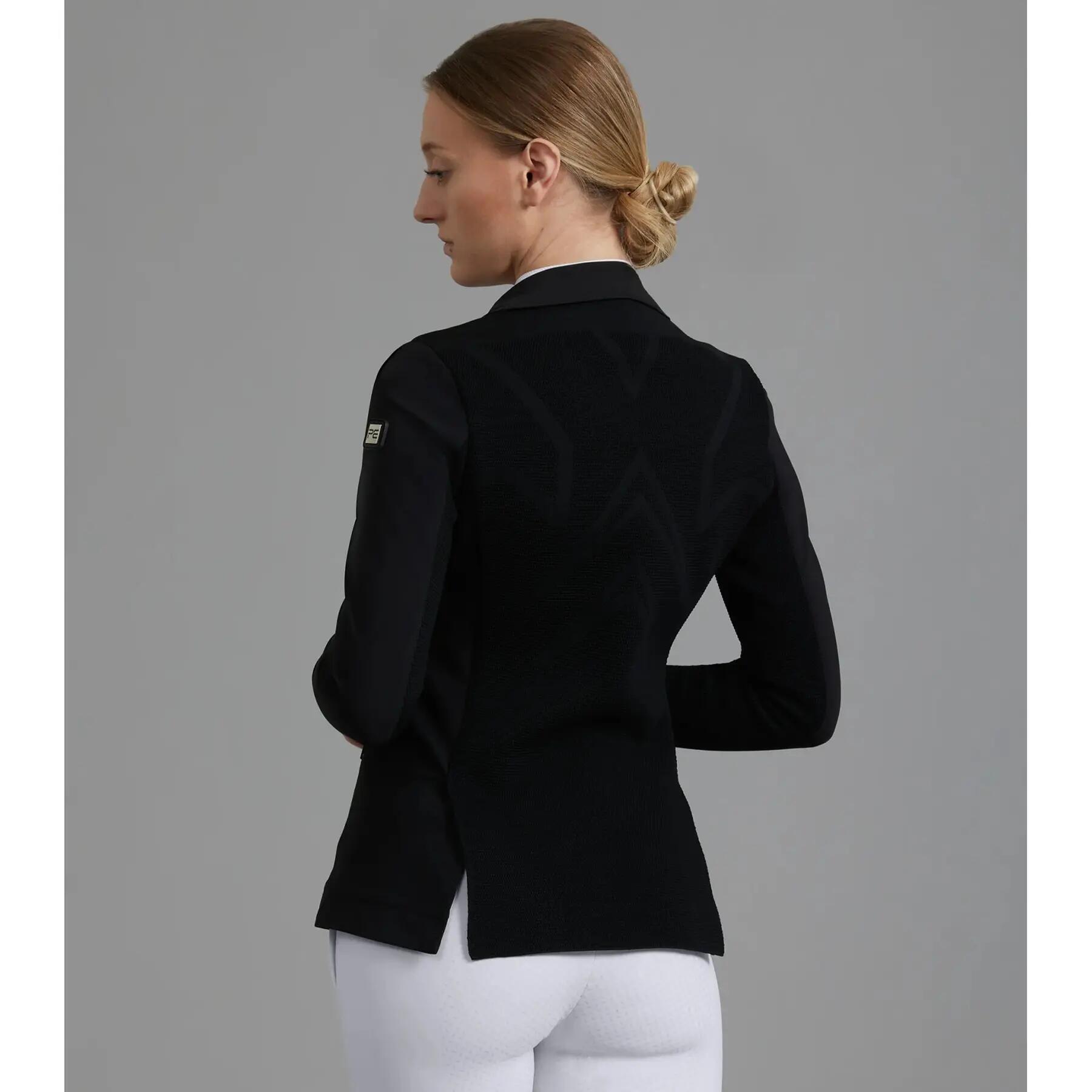 Discover new heights of performance with equestrian wear, focusing intensely on details and innovative fabric technology. Built around high-quality fabrics and technical materials, the BLACK LABEL represents the pinnacle of refined aesthetics, elite performance, and timeless craftsmanship. This ladies' competition jacket is perfect for a wide range of equestrian disciplines. The construction of this innovative design combines different panels of technical fabrics. The front of this jacket is made from a lightweight and smooth material that feels luxuriously soft to the touch and comfortable against your skin. Evolved for the modern rider, the back and arms incorporate a technical 3D knit that molds to the muscular anatomy of the rider’s back and shoulders. This innovative construction allows for improved freedom of movement, while creating unparalleled breathability, ideal for the intensity of competition. Classically tailored, this competition jacket is shaped to provide a flattering silhouette, with meticulously placed style lines. A traditional lapel collar sits atop a concealed YKK zipper kept tidy by a snap closure. Two pockets offer space to store your valuables, with added security provided by matte finish zippers. The subtle matte style continues through the finer details of this jacket, including the branded snap closures, and the PE marking at the wrist edge. Our signature chrome PE badge is located on the left arm of the rider, showing continuity with our existing collection. A raised PE shape is elegantly positioned on the right arm of the rider, boasting the quality and functionality of this luxury performance jacket. An elegant statement piece, this competition jacket is sure to deliver a classic and sophisticated aesthetic. The soft shade of French Navy allows you to make a professional impression in the arena, refreshing your competition wardrobe. Innovation is part of our company DNA. We have integrated decades of expertise into exciting new advancements in performance textiles. Pushing the boundaries of current industry standards, every detail is considered, bringing new heights to your equestrian wear. The Competition Jacket Quarto Ladies is a key representative of these values, making luxury and high-end designs accessible and affordable.