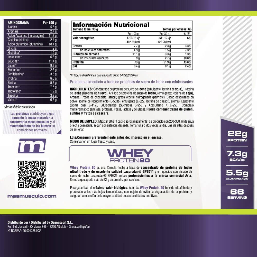 MASmusculo Whey Protein80 is a food product based on ultrafiltered whey protein, further enriched with whey protein isolate, from the best Lacp raw material