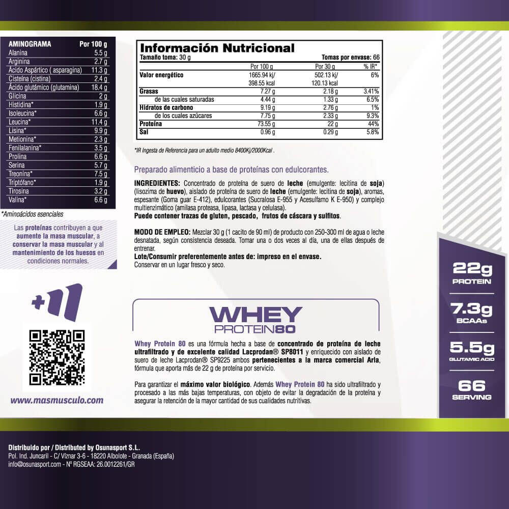MASmusculo Whey Protein80 is a food product based on ultrafiltered whey protein, further enriched with whey protein isolate, from the best Lacp raw material