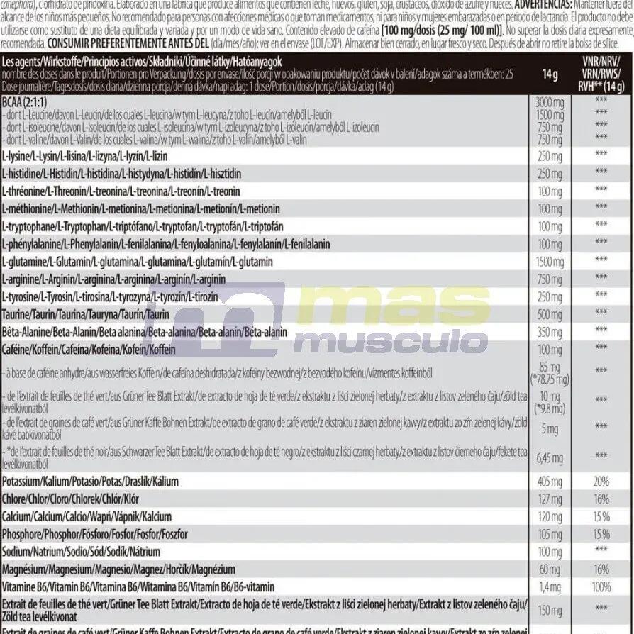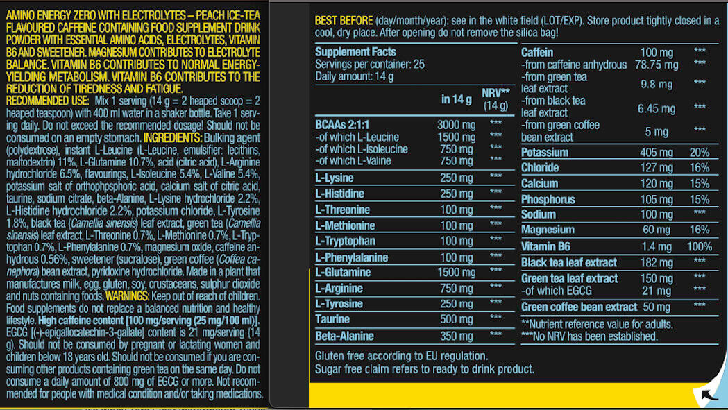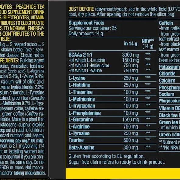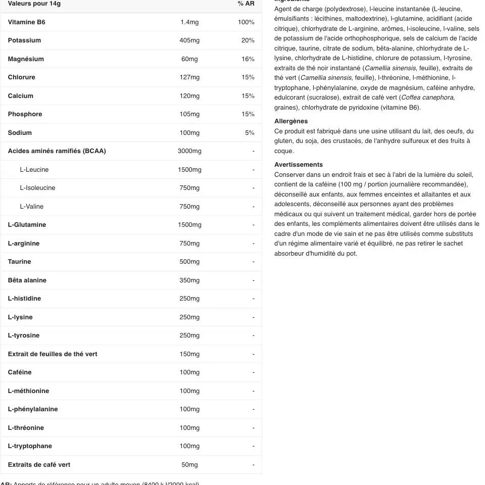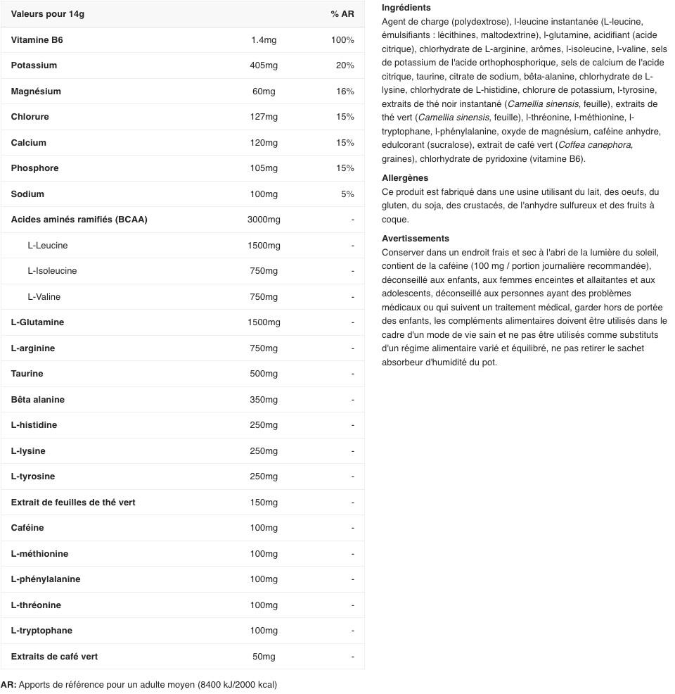 Ingredients Pineapple-Mango: Instant L-Leucine (L-leucine, emulsifier: lecithins, maltodextrin) 11%, L-glutamine 10.7%, flavors, bulking agent (polydextrose), acidifier (citric acid), L-arginine hydrochloride 6.5%, L-isoleucine 5.4%, L-valine 5.4%, potassium salts of orthophosphoric acid, calcium salts of citric acid, taurine, sodium citrate, beta-Alanine, L-lysine hydrochloride 2.2%, L-histidine hydrochloride 2,2%, potassium chloride, L-tyrosine 1.8%, green tea leaf extract (Camellia sinensis), L-threonine 0.7%, L-methionine 0.7%, L-tryptophan 0.7%, L-phenylalanine 0.7%, magnesium oxide , sweetener (sucralose), caffeine anhydrous 0.61%, green coffee seed extract (Coffea canephora), colorants (tartrazine, Allura Red AC)*, pyridoxine hydrochloride. Ingredients Lemon: Bulking agent (polydextrose), acidifier (citric acid), instant L-Leucine (L-Leucine, emulsifier : lecithin, maltodextrin) 11%, L-Glutamine 10.7%, L-Arginine hydrochloride 6.5%, L-Isoleucine 5.4%, L -Valine 5.4%, flavourings, potassium salt of orthophosphoric acid, calcium salt of citric acid, taurine, sodium citrate, beta-Alanine, L-Lysine hydrochloride 2.2%, L-Histidine hydrochloride 2.2%, potassium chloride, L-Tyrosine 1.8%, green tea leaf extract (Camellia sinensis), L-Threonine 0.7%, L-Methionine 0.7%, L-Tryptophan 0.7%, L-Phenylalanine 0.7%, magnesium oxide, caffeine anhydrous 0.61%, sweetener (sucralose), green coffee (Coffea canephora) seed extract, pyridoxine hydrochloride, colorants (tartrazine*, indigotine). *Tartrazine, Rouge allura AC: may have adverse effects on activity and attention in children.