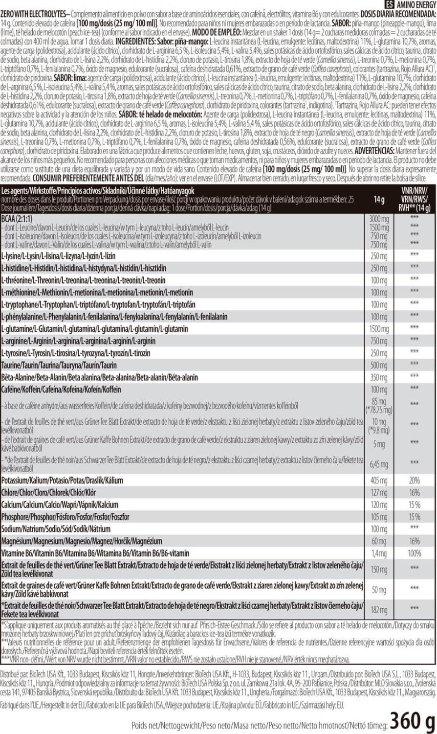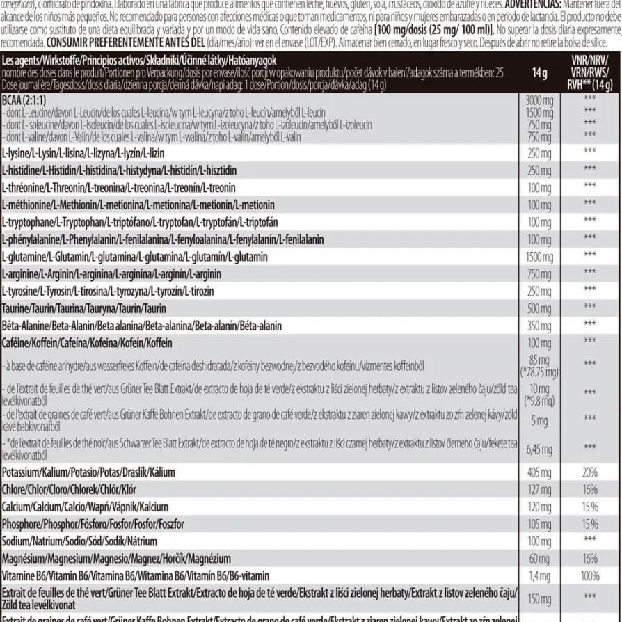 Ingredients Pineapple-Mango: Instant L-Leucine (L-leucine, emulsifier: lecithins, maltodextrin) 11%, L-glutamine 10.7%, flavors, bulking agent (polydextrose), acidifier (citric acid), L-arginine hydrochloride 6.5%, L-isoleucine 5.4%, L-valine 5.4%, potassium salts of orthophosphoric acid, calcium salts of citric acid, taurine, sodium citrate, beta-Alanine, L-lysine hydrochloride 2.2%, L-histidine hydrochloride 2,2%, potassium chloride, L-tyrosine 1.8%, green tea leaf extract (Camellia sinensis), L-threonine 0.7%, L-methionine 0.7%, L-tryptophan 0.7%, L-phenylalanine 0.7%, magnesium oxide , sweetener (sucralose), caffeine anhydrous 0.61%, green coffee seed extract (Coffea canephora), colorants (tartrazine, Allura Red AC)*, pyridoxine hydrochloride. Ingredients Lemon: Bulking agent (polydextrose), acidifier (citric acid), instant L-Leucine (L-Leucine, emulsifier : lecithin, maltodextrin) 11%, L-Glutamine 10.7%, L-Arginine hydrochloride 6.5%, L-Isoleucine 5.4%, L -Valine 5.4%, flavourings, potassium salt of orthophosphoric acid, calcium salt of citric acid, taurine, sodium citrate, beta-Alanine, L-Lysine hydrochloride 2.2%, L-Histidine hydrochloride 2.2%, potassium chloride, L-Tyrosine 1.8%, green tea leaf extract (Camellia sinensis), L-Threonine 0.7%, L-Methionine 0.7%, L-Tryptophan 0.7%, L-Phenylalanine 0.7%, magnesium oxide, caffeine anhydrous 0.61%, sweetener (sucralose), green coffee (Coffea canephora) seed extract, pyridoxine hydrochloride, colorants (tartrazine*, indigotine). *Tartrazine, Rouge allura AC: may have adverse effects on activity and attention in children.