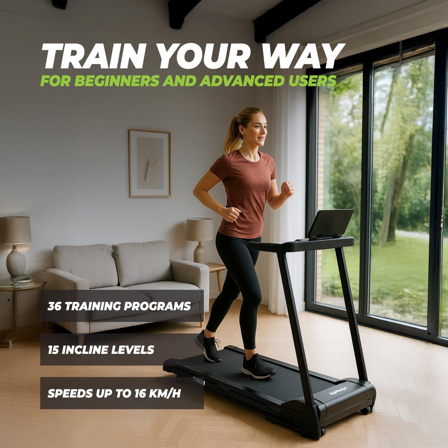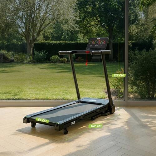 The TR90i is a popular foldable treadmill among home athletes. The treadmill features 36 training programs and is compatible with training apps such as Zwift, Kinomap, and Fitshow. The treadmill has a high maximum load capacity of 120 kg, making it suitable for intensive and regular training. Suitable for running up to 14 km/h.