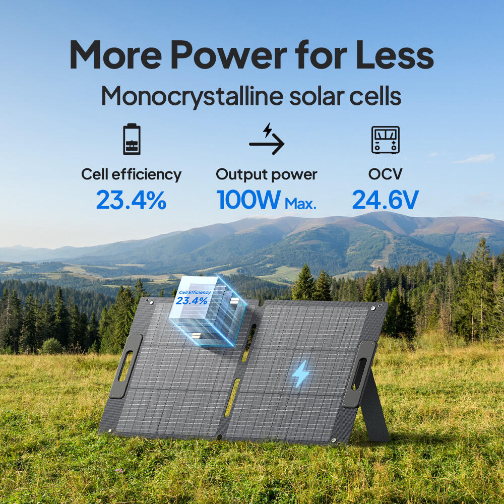 - [High Cell Efficiency] - Built with monocrystalline solar cells, portable 100W solar panel can convert up to 23.4% of sunlight into usable electricity, giving you solar energy even in bad weather.