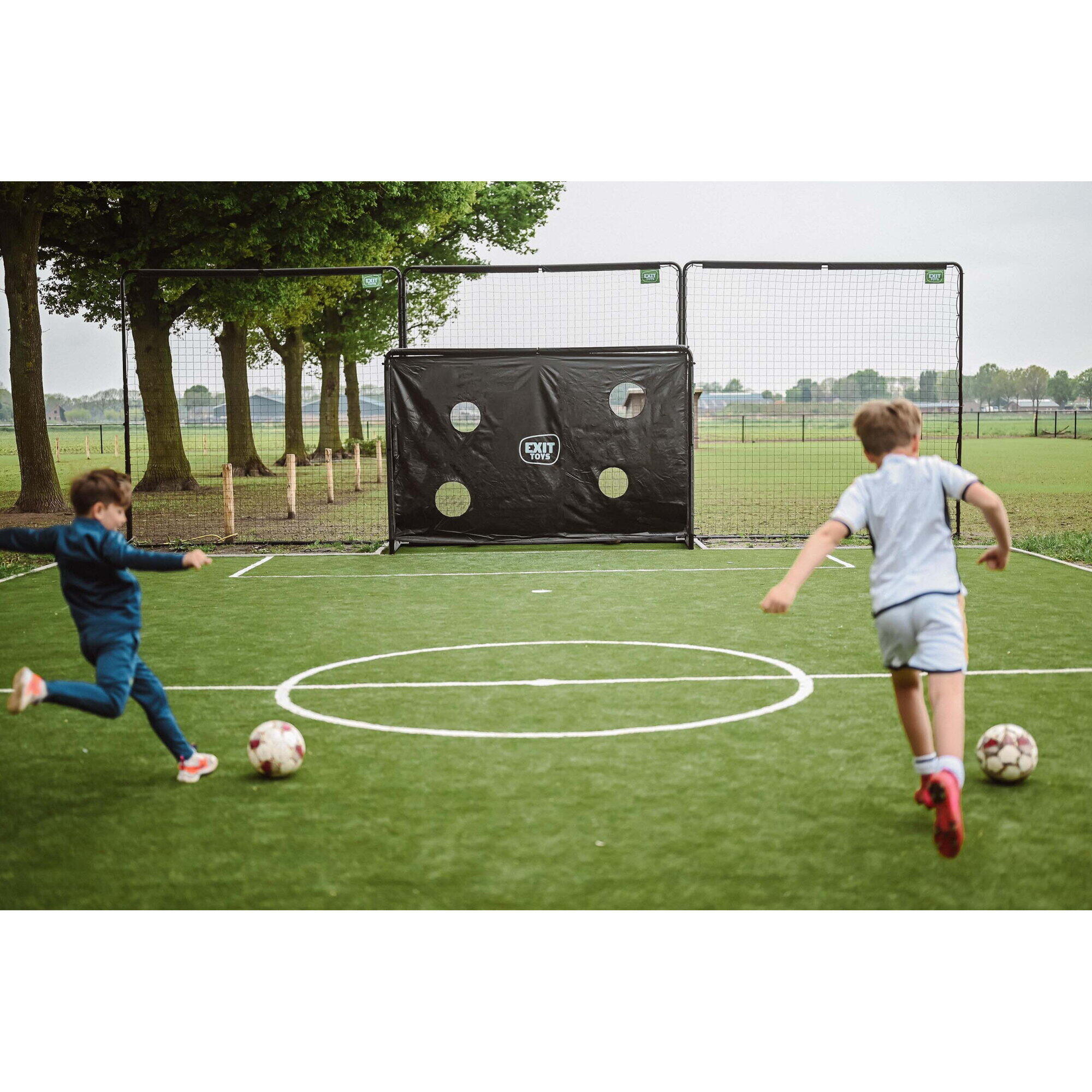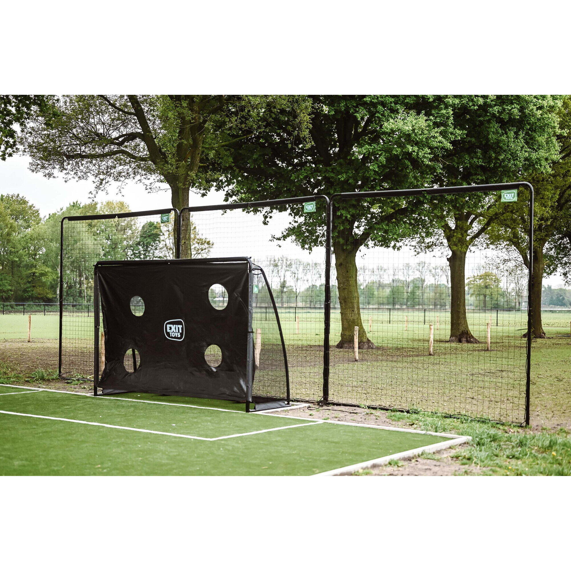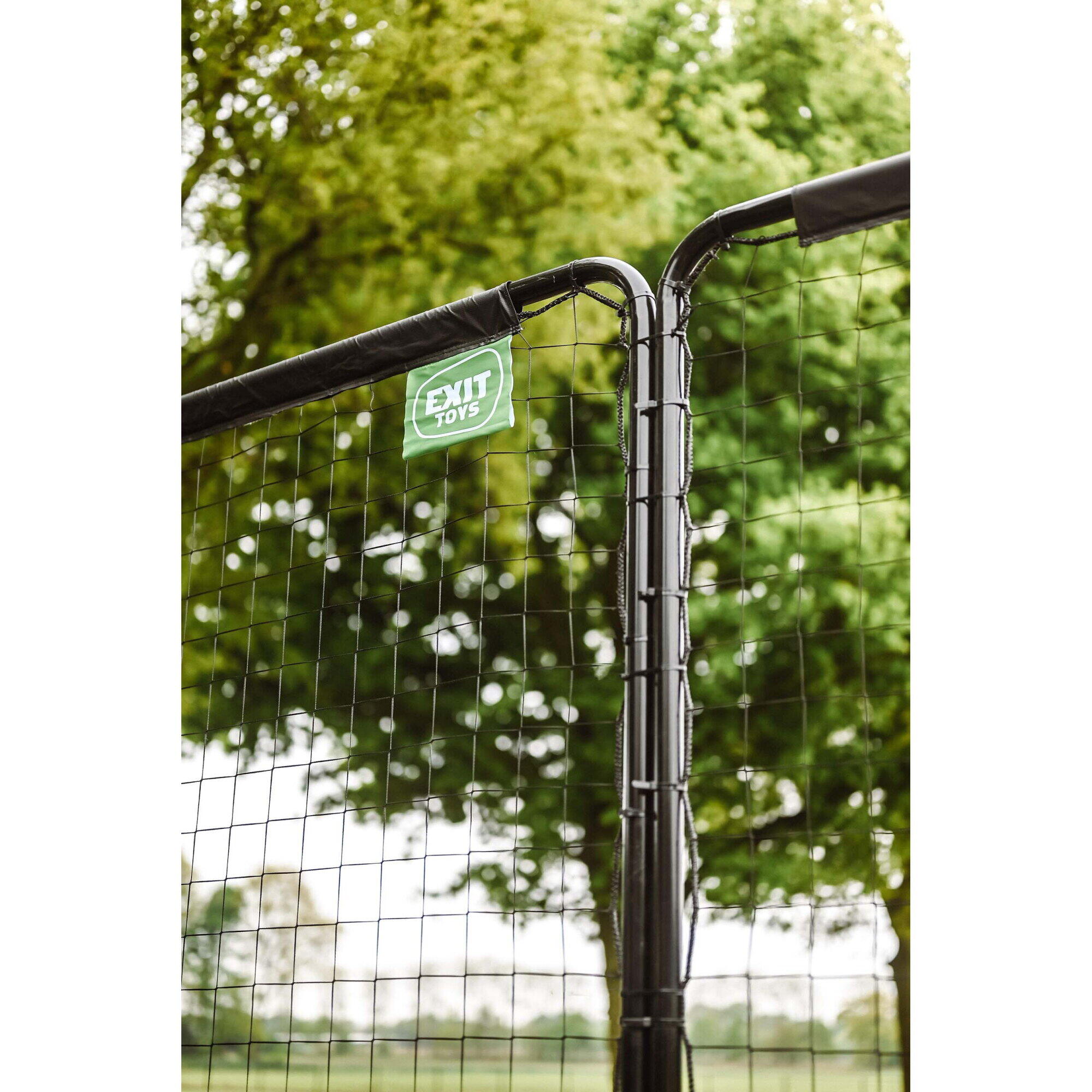 The EXIT Backstop sport net is the ideal ball catcher for the garden. The ball catcher consists of three black frames, each 10 x 10 ft, which can be attached to each other up to a height of 9 metres and width of 3 metres. The frame is galvanised and powder-coated for a long lifespan and a beautiful look. The horizontal legs, which are anchored using pegs and a ground anchor, ensure that the sport net stays in place even with the most powerfully kicked ball. The EXIT Backstop sport net fits into a small or a large garden, because the three frames can be set at various angles. Also on a sport field, this net will not be out of place.