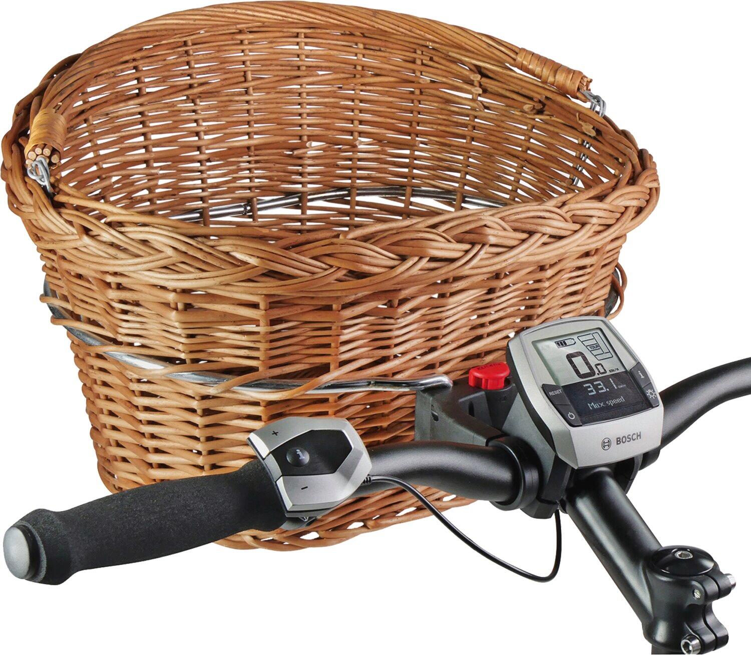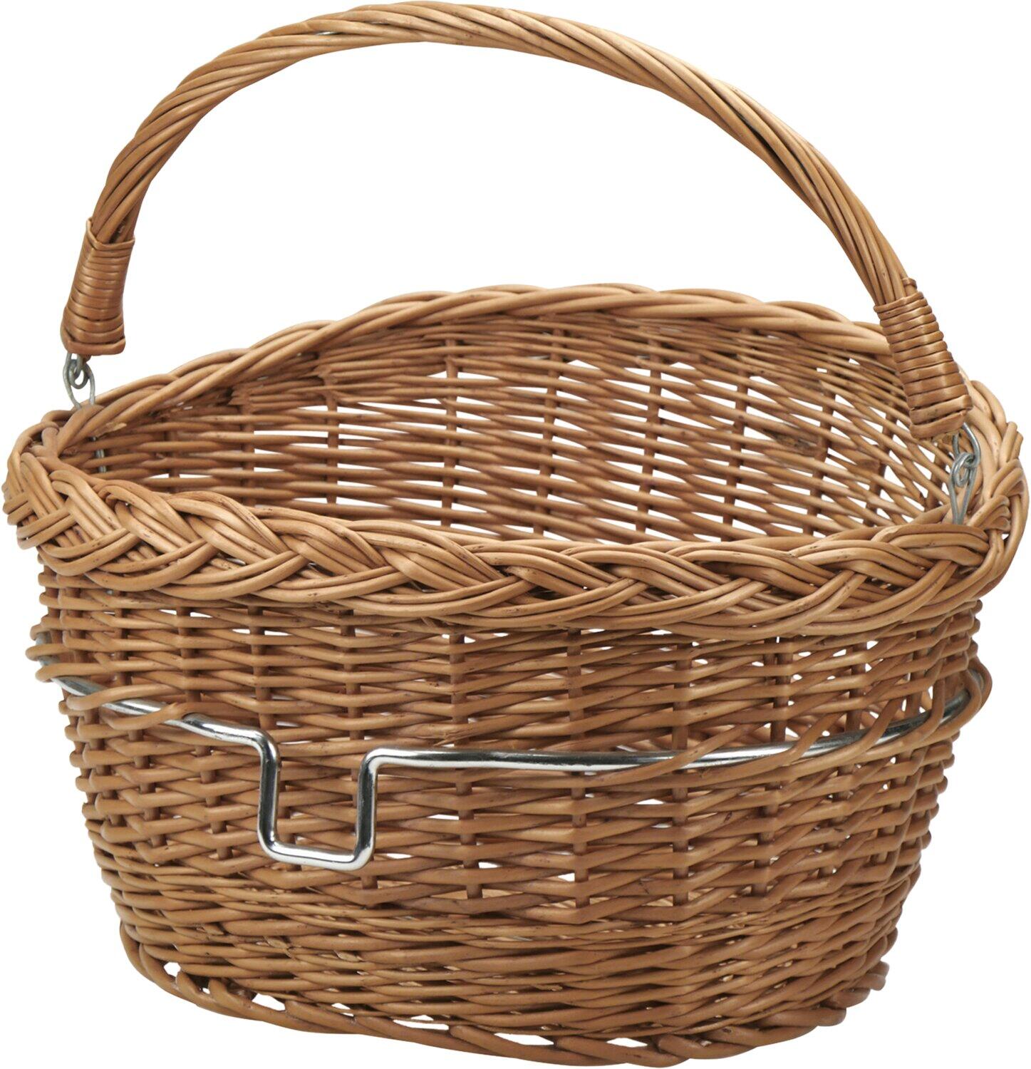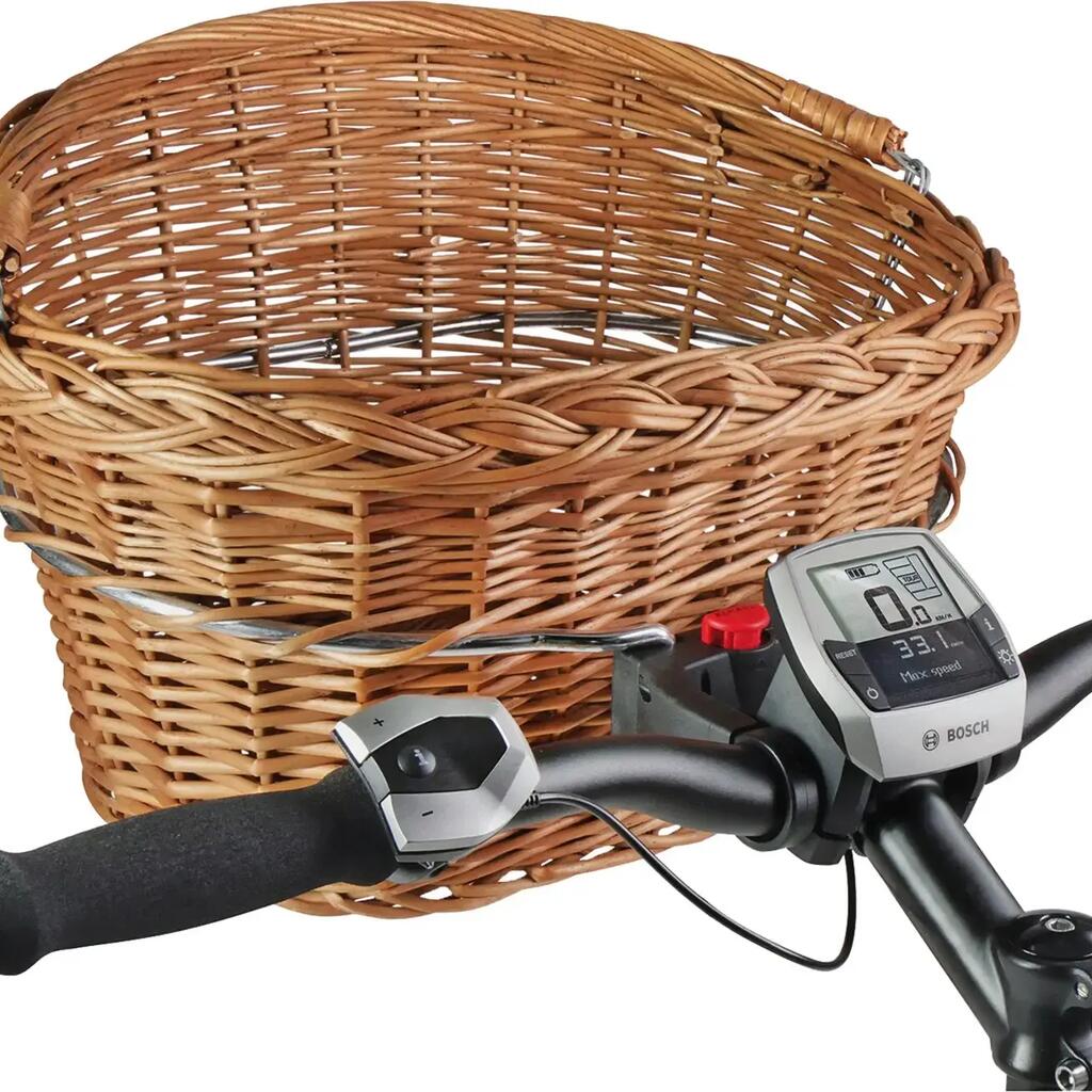beige woven wicker basket 40×31×30 cm (18 L) with integrated chrome bar, KLICKfix-compatible, ideal for city bikes.