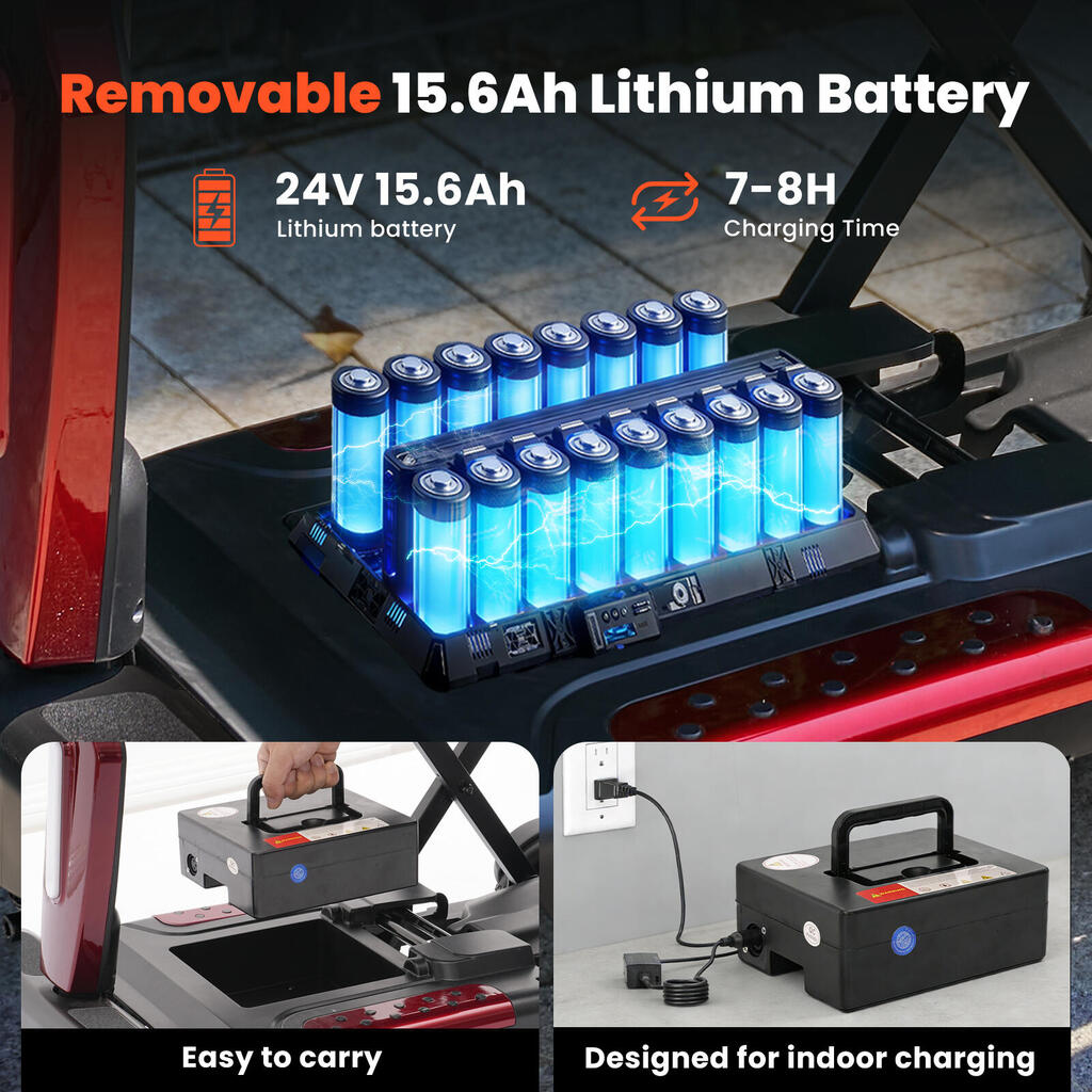 Stay mobile all day thanks to the high-capacity 24V 15.6Ah lithium battery, offering an impressive range of 20-30km per charge. Designed for ultimate convenience, this foldable mobility scooter features a removable battery that can be easily carried indoors for charging (7-8 hours). Say goodbye to range anxiety and hello to spontaneous trips to the park or grocery store with this long-range travel scooter.