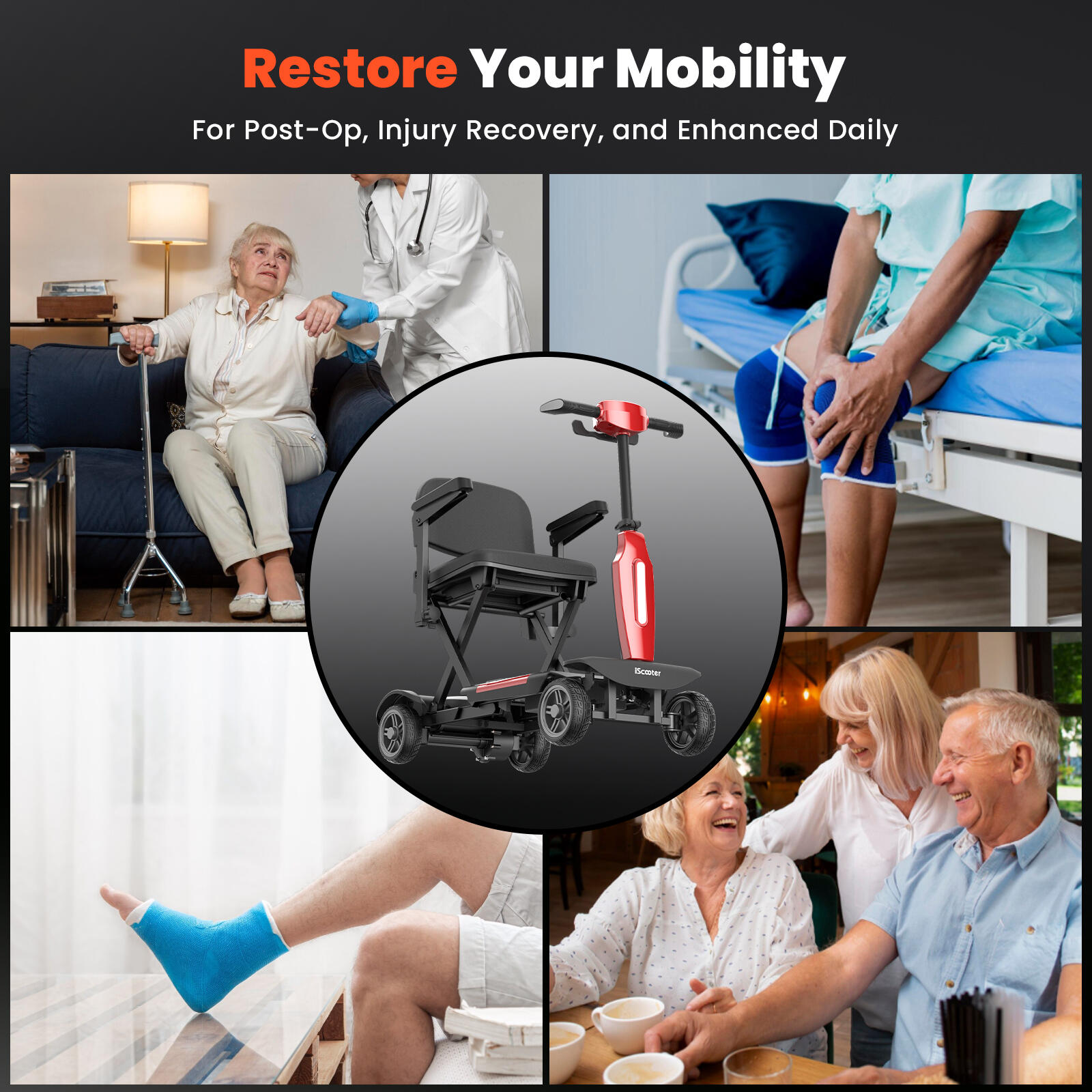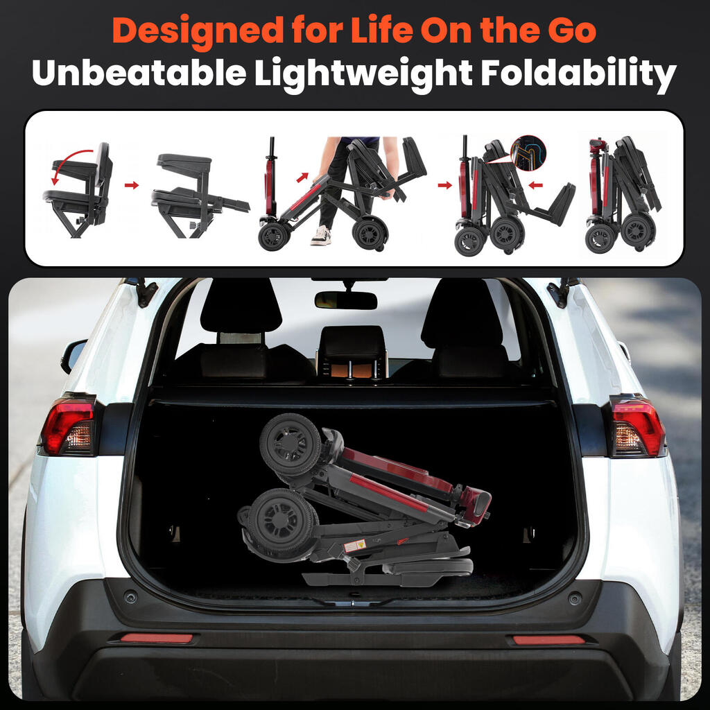 Freedom means going wherever you want, whenever you want. This lightweight travel scooter folds down to a compact size of just 38×50×72cm, making it effortless to store in a car trunk, closet, or airplane cabin. With a net weight of only 23kg, it's one of the most portable folding mobility scooters available, perfect for seniors with active lifestyles who love to travel.