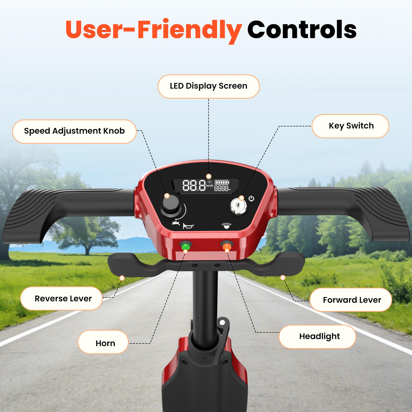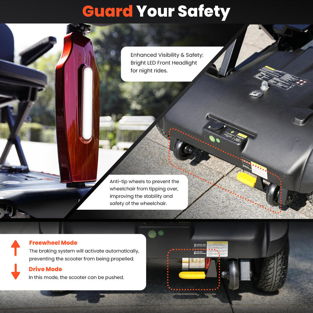 Your security is our priority. The iScooter X11 is equipped with a bright LED headlight for nighttime visibility, anti-tip wheels for enhanced stability, and a dual-mode braking system (automatic freewheel mode and drive mode). The user-friendly controls include an intuitive LED display, speed adjustment knob, forward/reverse levers, and an electric lock key with horn. Built to support up to 120kg, this safe mobility scooter for seniors ensures every journey is both comfortable and secure.