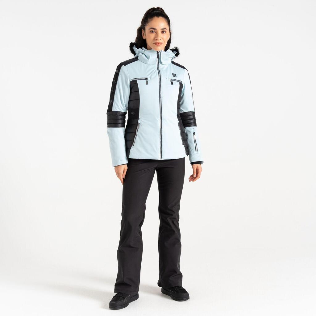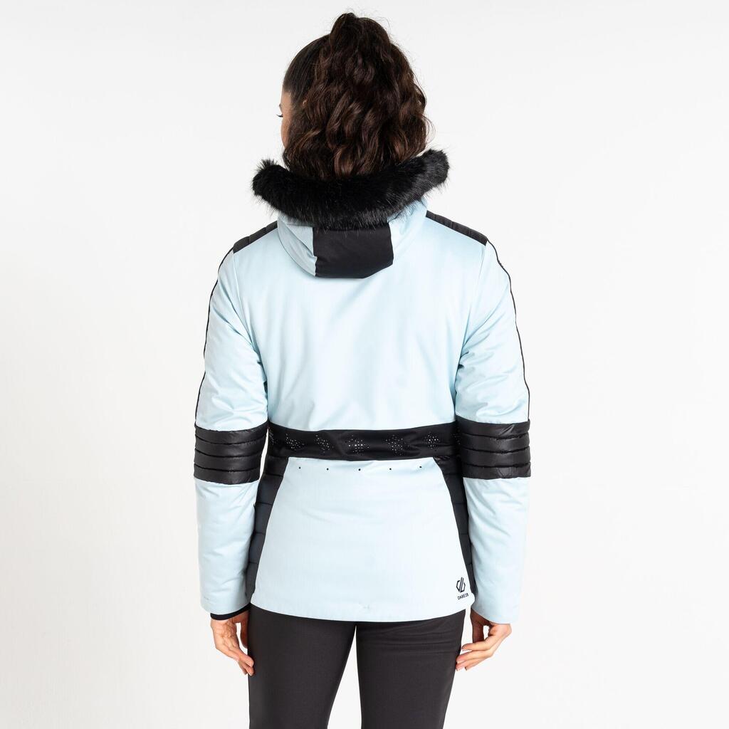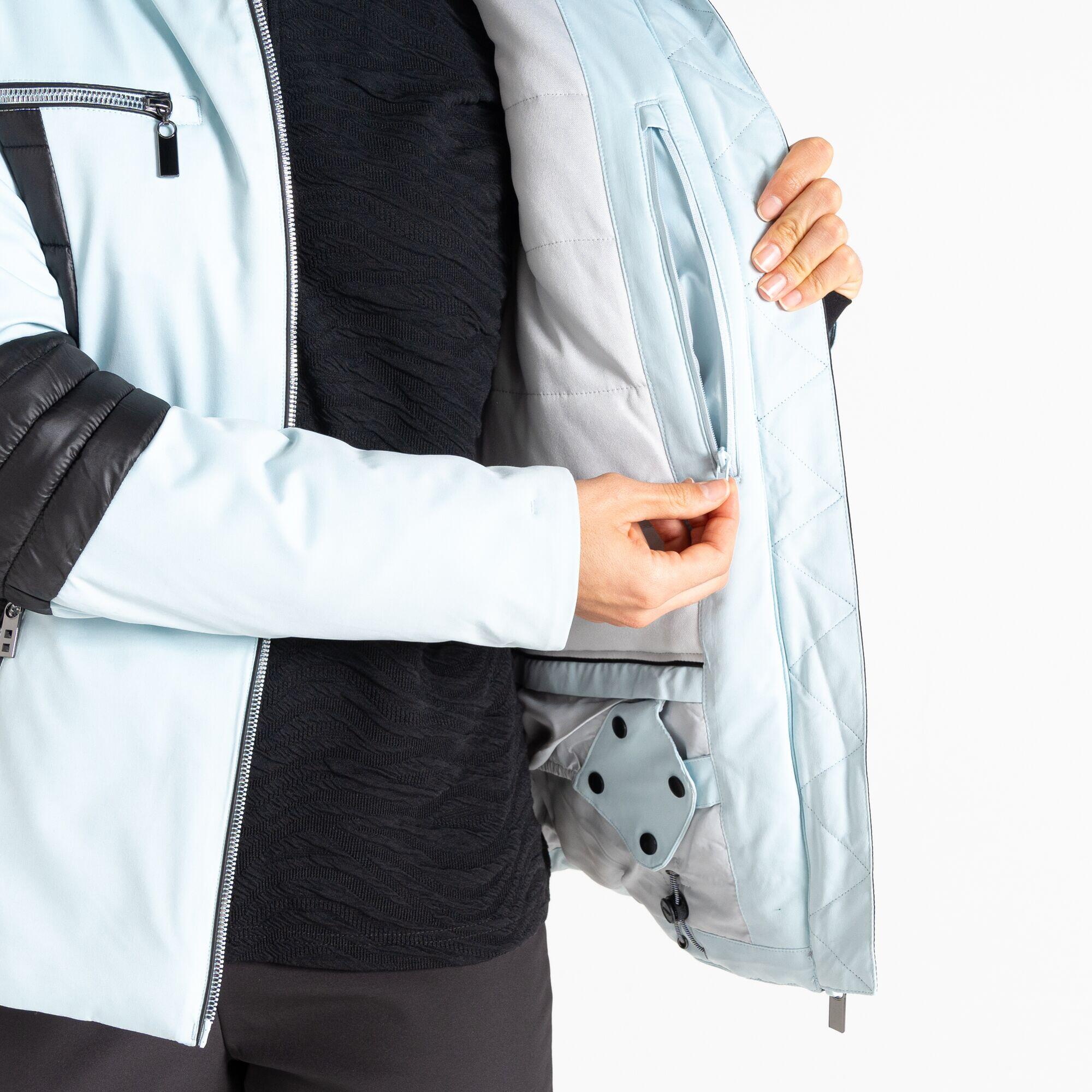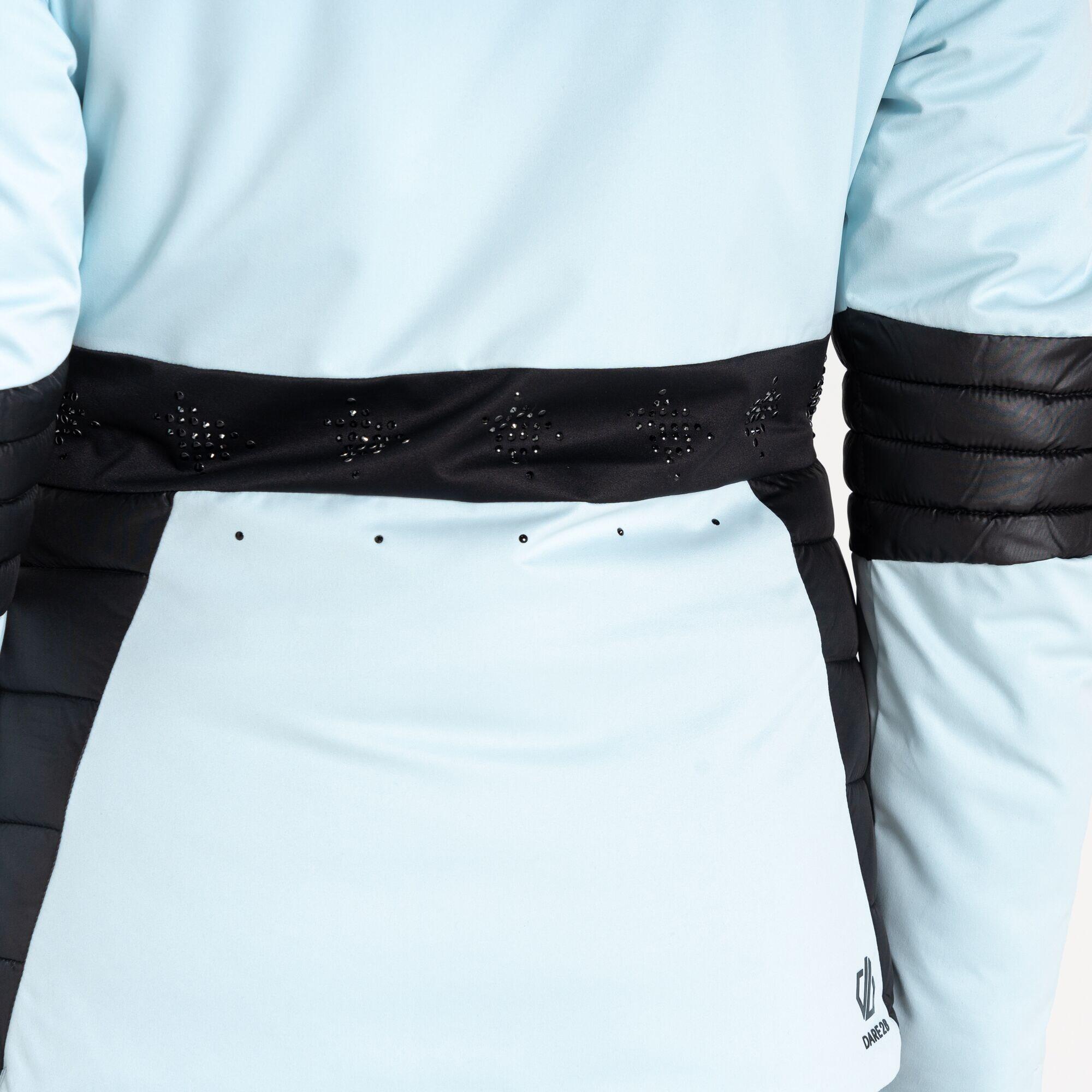 The Dare 2b x Swarovski Enlighten Jacket, crafted from advanced waterproof and breathable fabric, provides comfort and weather protection as you carve down the mountain. The water-repellent finish and