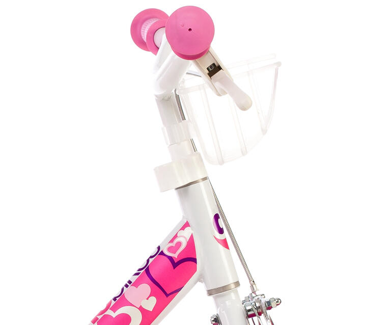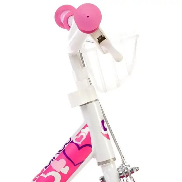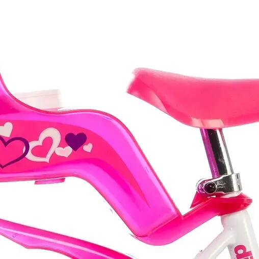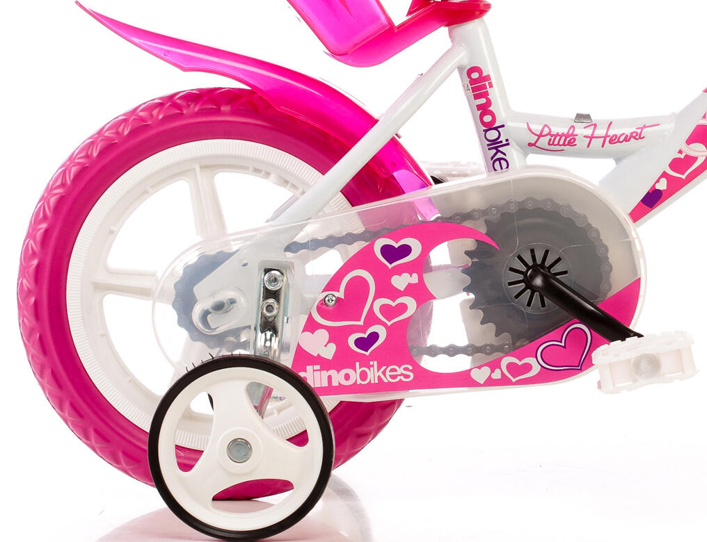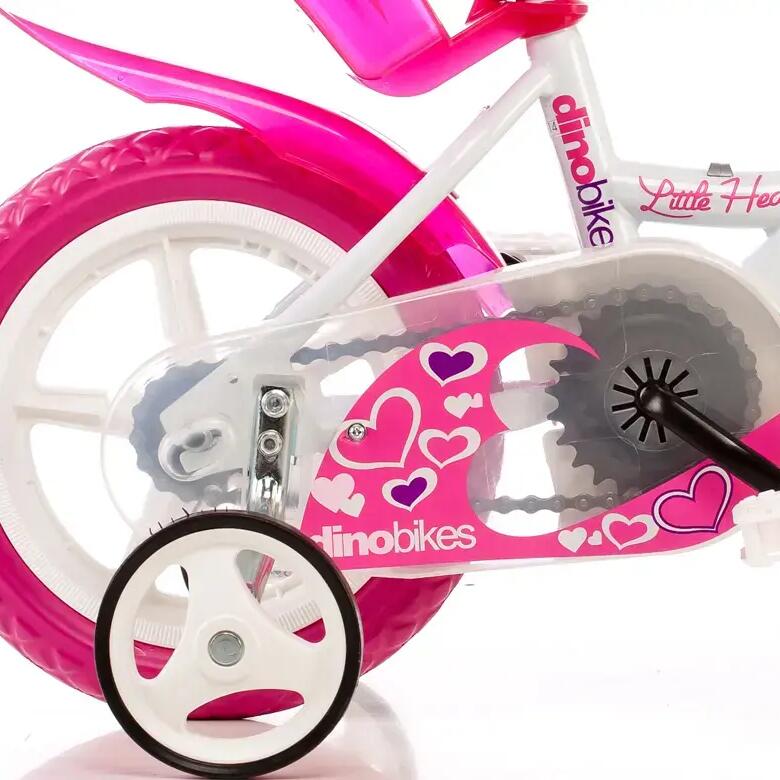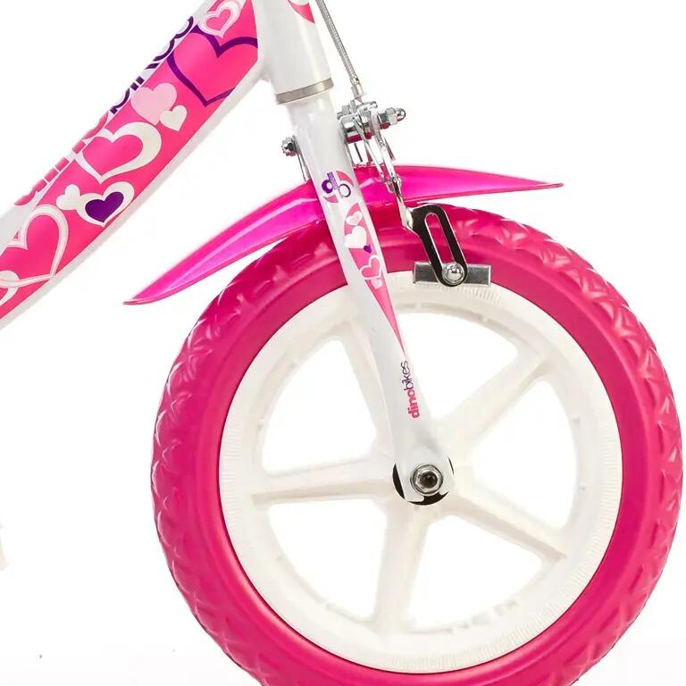 Dino Little Heart 12 inch girls bike — 21 cm frame, V-brake, EVA puncture-proof tyres, white/pink.