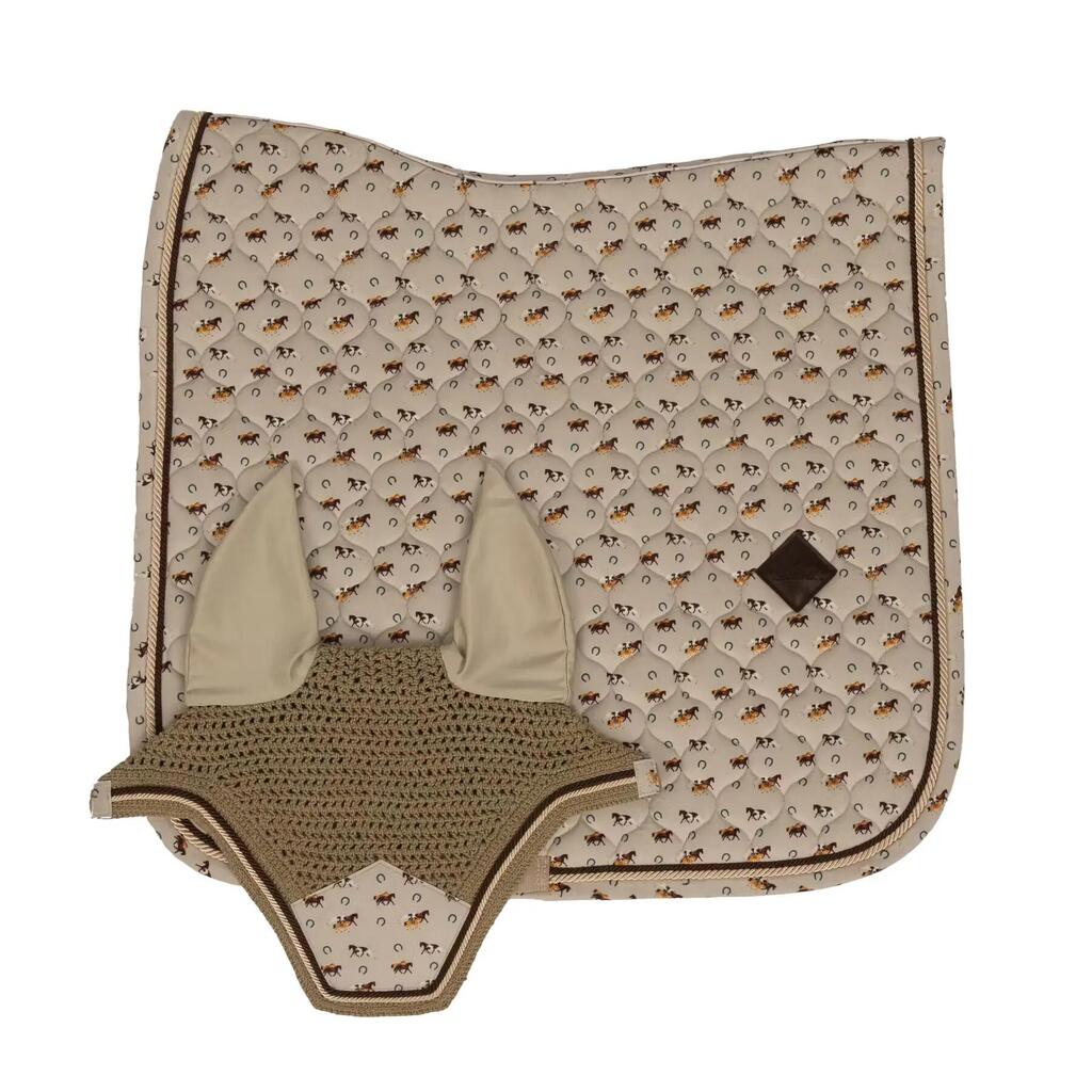 The Saddle Pad Velvet Horse printing Show Jumping is super stylish and classy ,with a double twisted piping. It features a print with horses and horseshoes. * Star quilting – Elegant star