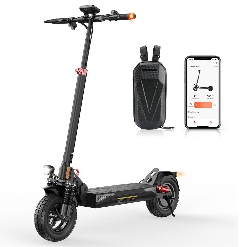 Foldable electric scooter with extended range, all-terrain tires, and integrated lighting system for urban commutes and outdoor adventures.