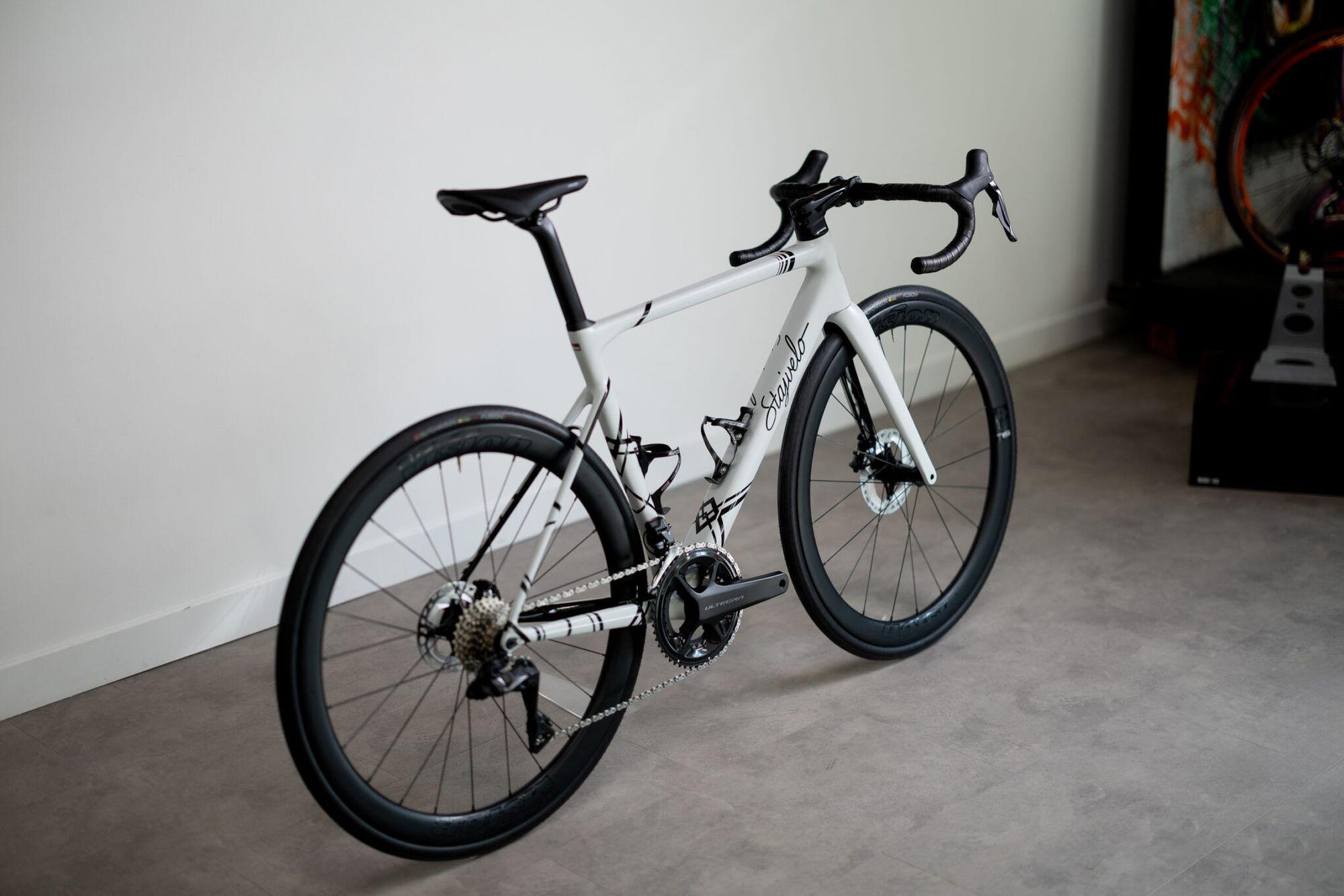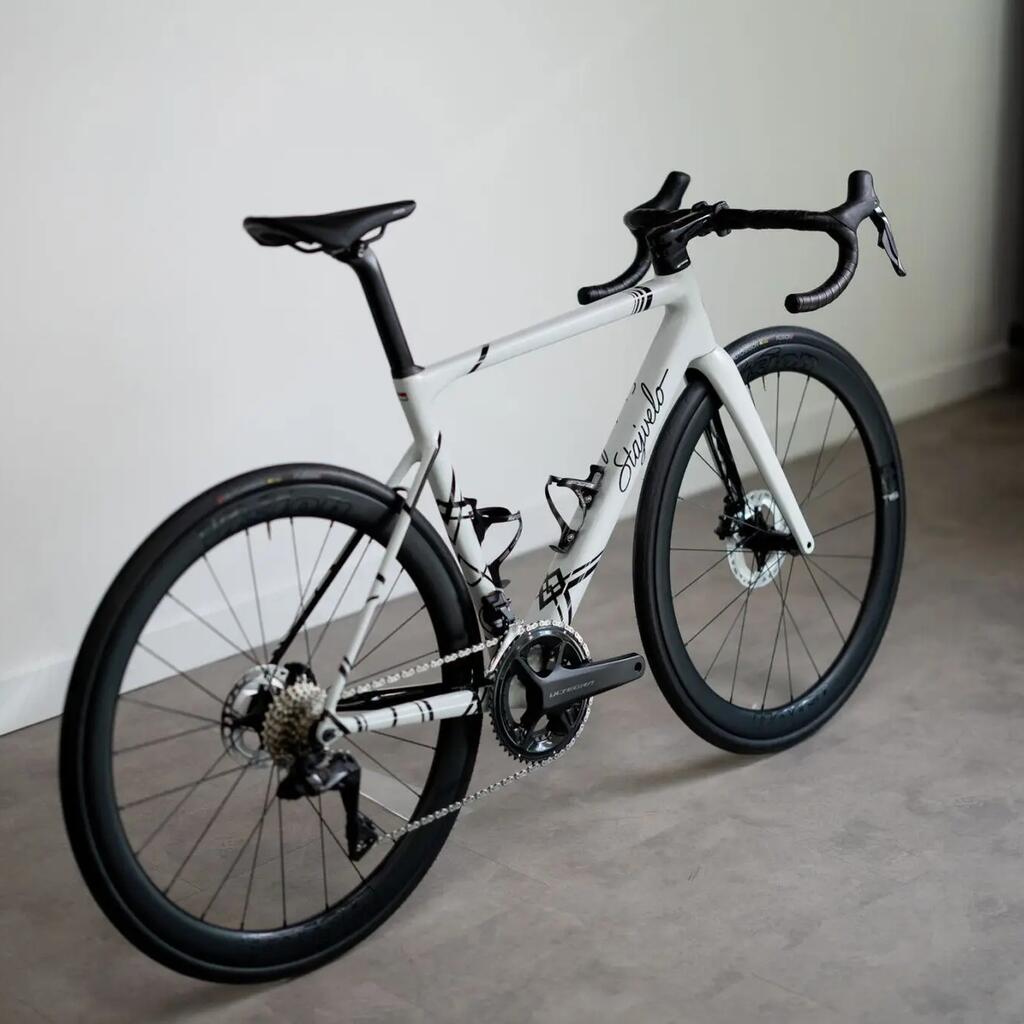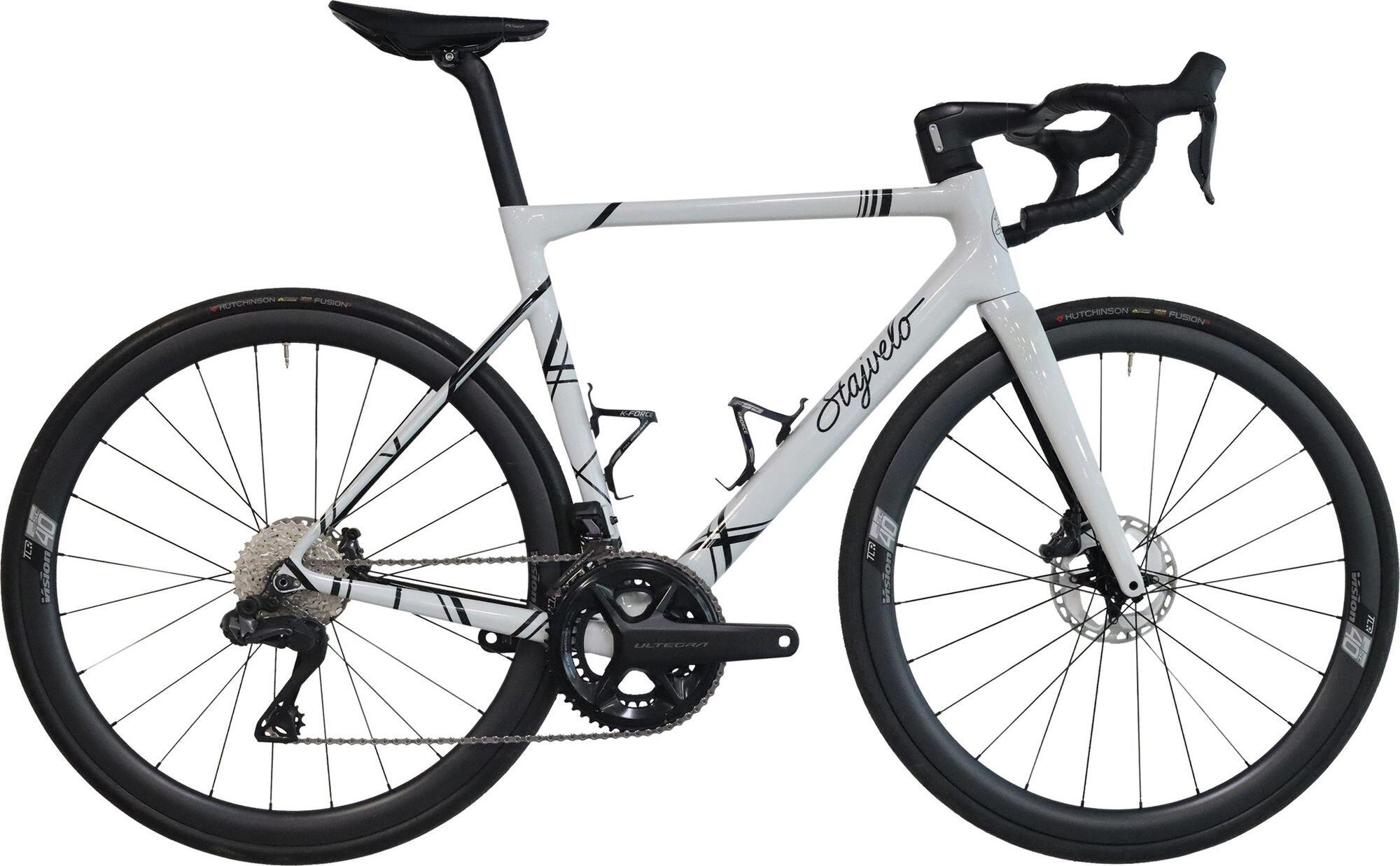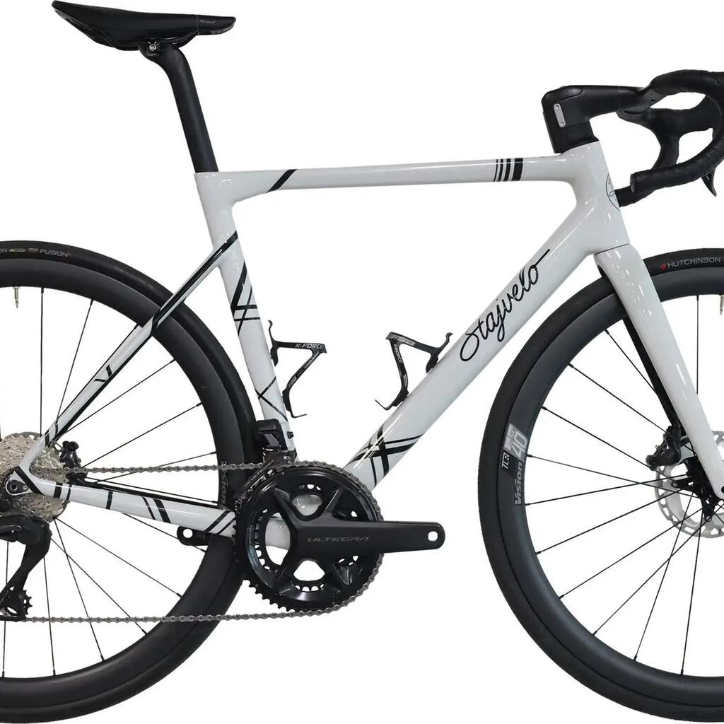 The Stajvelo Beau Rivage is a top-of-the-range road bike.Its T1100 carbon frame and Shimno Ultegra Di2 components will help you achieve your goals.Main features: Carbon frame, fork and seatpost. Shimano Ultegra Di2 2x12-speed drivetrain. Shimano Ultegra hydraulic disc brakes.Features: Frame Carbon : UD-T1100 Carbon Fork Carbon: UD-T1100 Carbon Shifters Shimano Ultegra Di2, 2x12-speed Front Derailleur Shimano Ultegra Di2 Rear Derailleur Shimano Ultegra Di2, 12-speed Cassette Shimano Ultegra, 11-34T Chain Shimano Crankset Shimano Ultegra, 52-36T Brakes Shimano Ultegra, Hydr. Disc Brake, /mm Shimano Rotors Wheelset Vision SC 40mm, HG freehub Tires Hutchinson Fusion 5 Perf, 700x28 mm Handlebar Vision Metron 5D Stem -- Saddle Fizik Vento Argo R5 Seatpost Carbon Weight -- Color Pur White Geometries: Frame size (cm) 47/XS 50/S 53/M 56/L 59/XL Seat tube (mm) 470 500 530 560 590 Top tube (mm) 515 537 555 577 600 Chainstay (mm) 420 420 420 420 420 Head tube (mm) 120 130 150 165 180 Head tube angle (°) 72.3 72.5 72.8 73 73.6 Seat tube angle (°) 75.5 74.5 73.5 73 72.8 Wheelbase (mm) - - - - - Stack (mm) 522 532 552 568 584 Reach (mm) 380 389 391 403 419