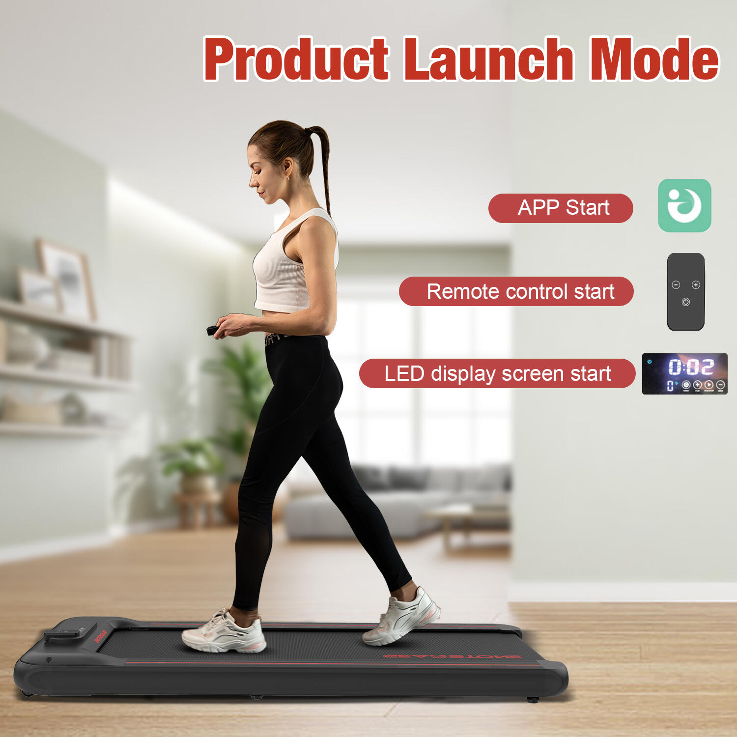 Walking Pad treadmill: speeds 1–6 km/h, LED display, remote control. Foldable, lightweight (20 kg), with wheels for easy storage. Maximum weight capacity 110 kg.