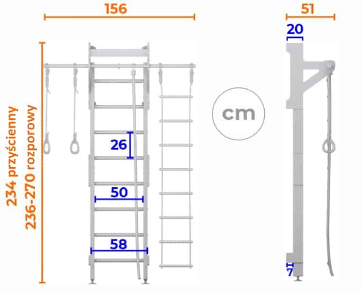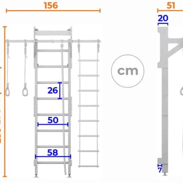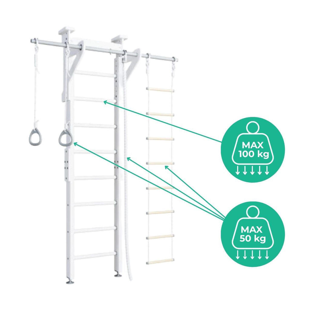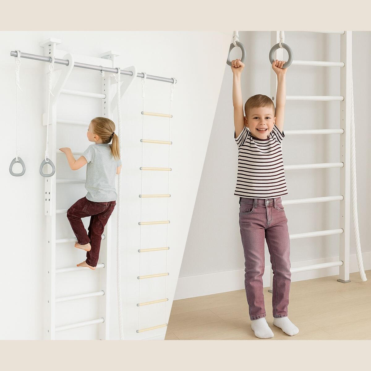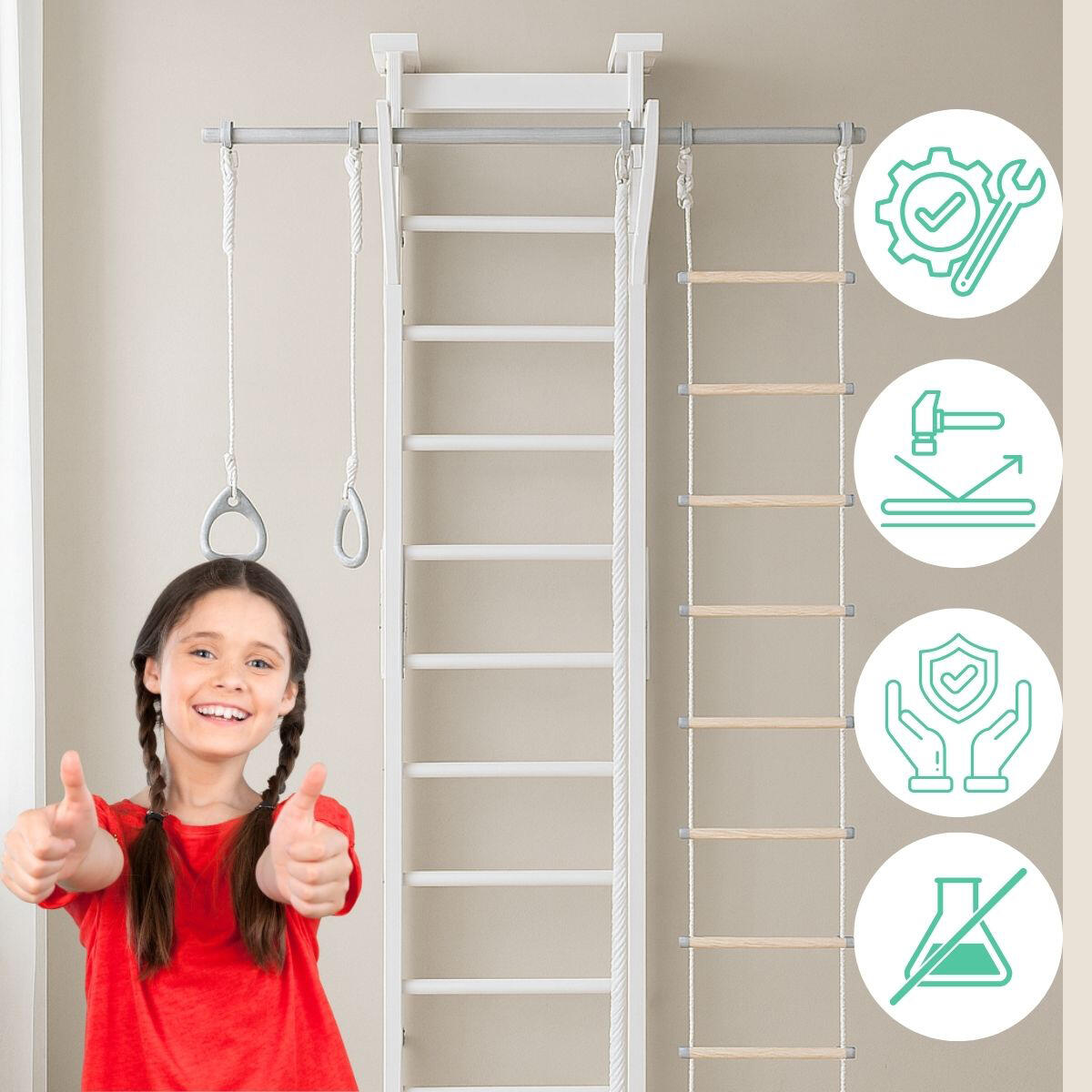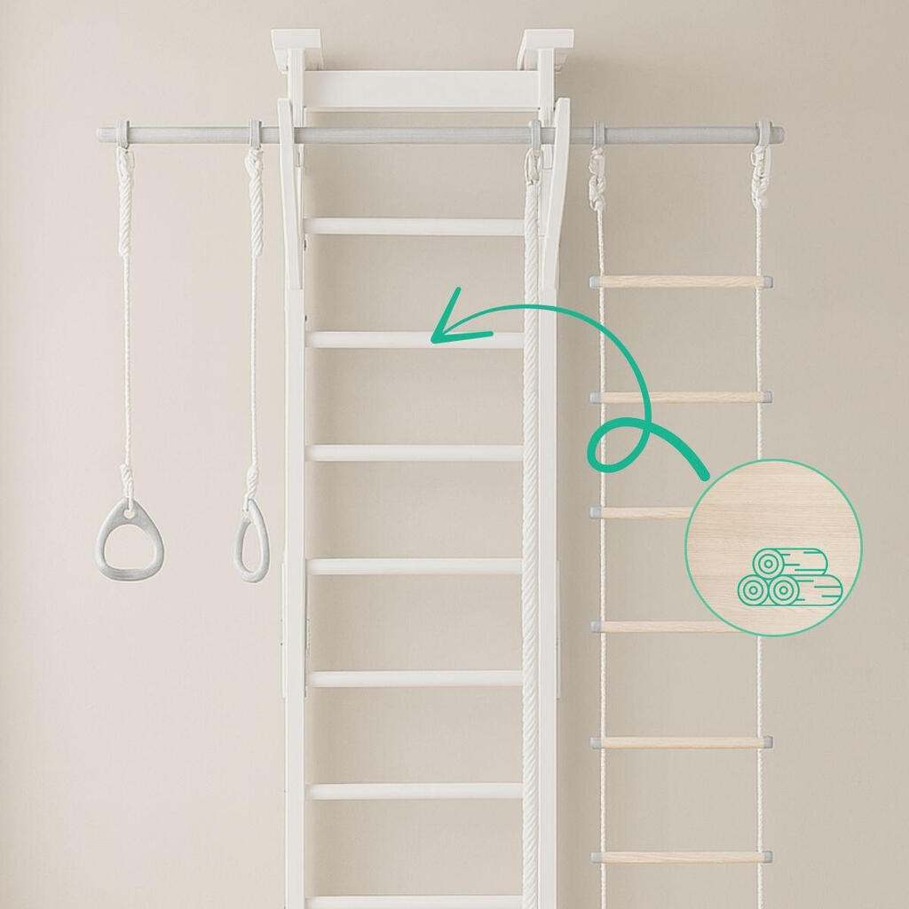 Eko 2 Wooden Wall Bars: Transform your home into a gym with this set featuring a pull-up bar, rings, and rope for family fitness!