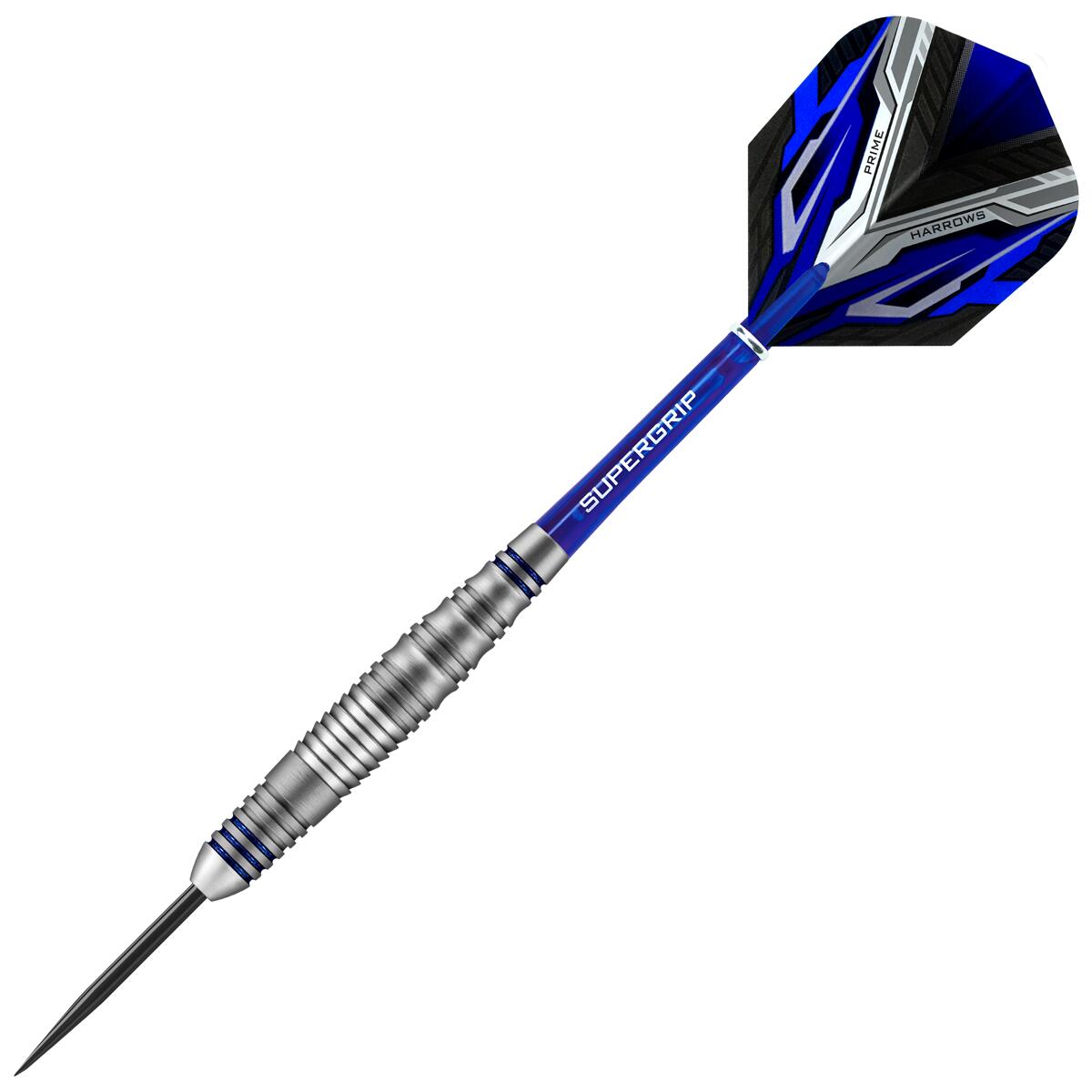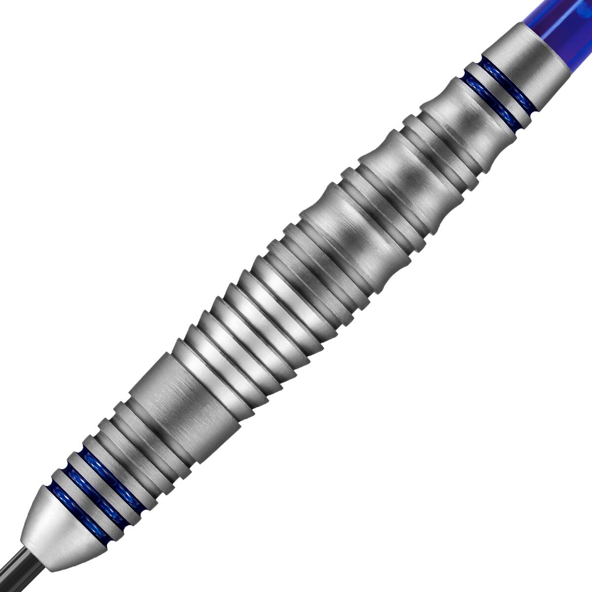 A tapered brass dart with a mix of shark, scalloped and ringed cuts. Premium brass dart. Supergrip shafts. 100 micron Prime flights. Tough matte silver coating with blue rings.