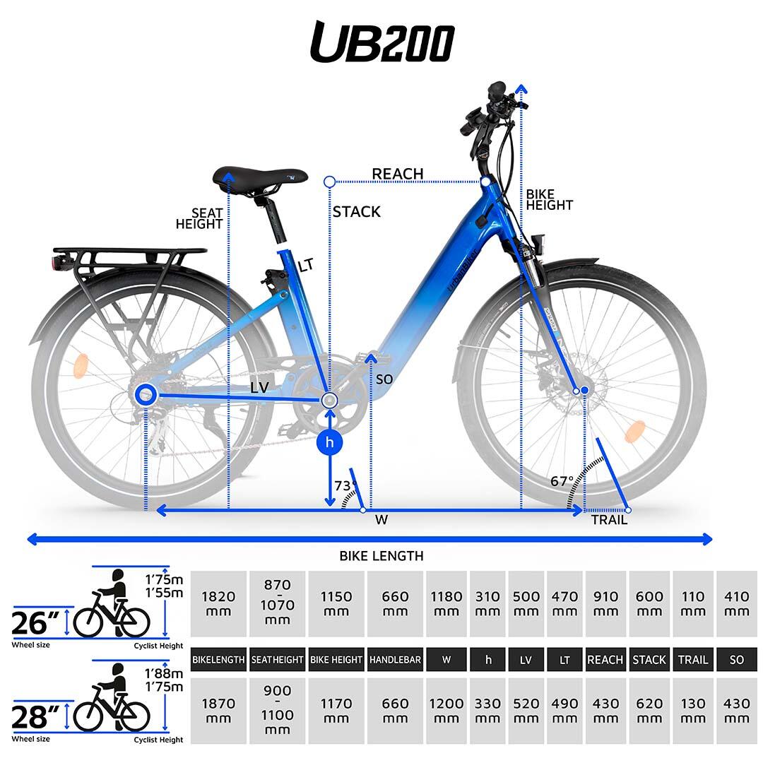 250W Bafang rear-wheel motor: powerful, quiet, and efficient. It assists you up to 25 km/h, making hills and longer rides easier while always controlling your effort level. Integrated (removable) 48V, 720Wh (15Ah) battery with anti-theft lock and included charger, ready to accompany you up to 140 km in EC.O mode, so you can forget about frequent recharging. Hydraulic disc brakes: immediate and safe response, even on inclines. Maximum safety on asphalt or trails with Maxxis Metroloads tires. Intuitive Bafang LCD display: Check your speed, distance traveled, and assistance level at a glance. An unexpected hill? Activate "Walk Mode" and walk alongside your bike with ease. The UB200 Redefine urban mobility with its dual suspension, an innovation designed to absorb impacts and protect you from uneven terrain, whether on asphalt, dirt roads, or cobblestones. Getting around town has never been so comfortable. Its low frame makes it easy to get on and off, even if you have reduced mobility or joint pain. The height-adjustable stem and the ergonomic design of the saddle and grips adapt to you, making every ride a pleasure. The robust and versatile wheels handle confidently on any surface. Plus, the rear rack lets you carry everything from your daily shopping to a package with ease. And with battery-powered lights, you only need one click to see and be seen, without worrying about additional recharging.