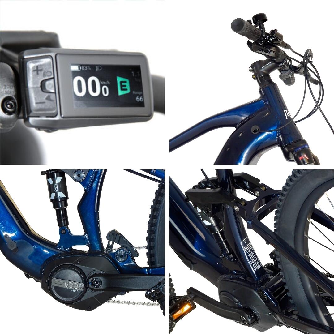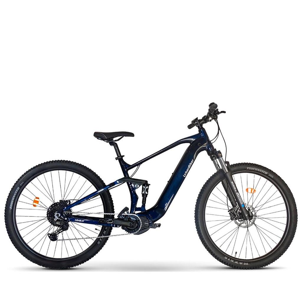 The UB410B is a dual-suspension electric mountain bike with a mid-drive motor, designed to offer stability, control, and power on demanding trails.