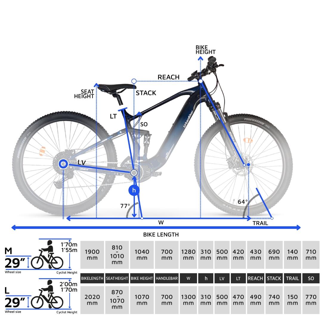 The UB410B stands out for its balance. The mid-drive motor, located in the center of the frame, improves weight distribution and provides a stable and predictable ride. 29” wheels They help maintain your trajectory and overcome obstacles with ease, while the geometry and dual suspension reduce fatigue and boost confidence.