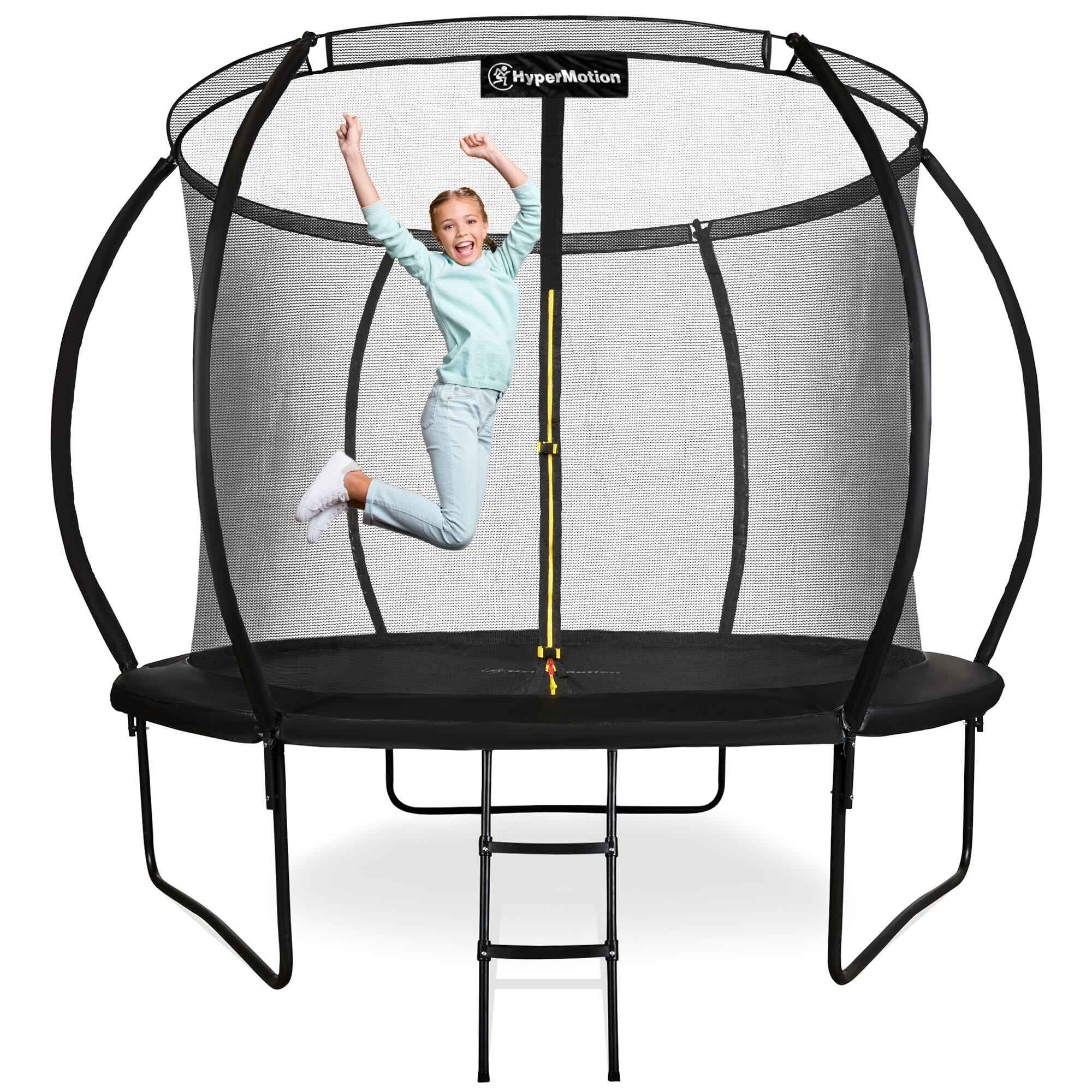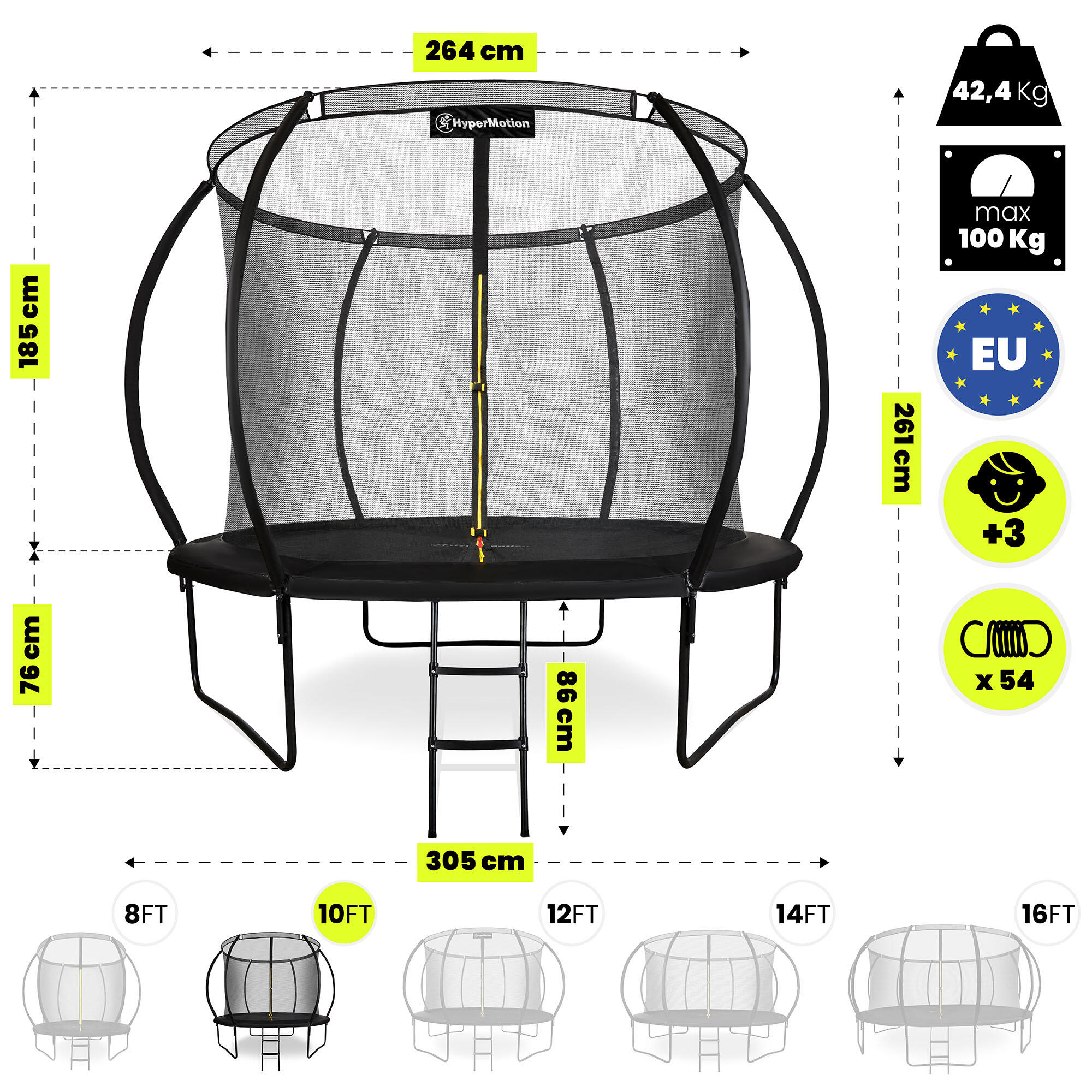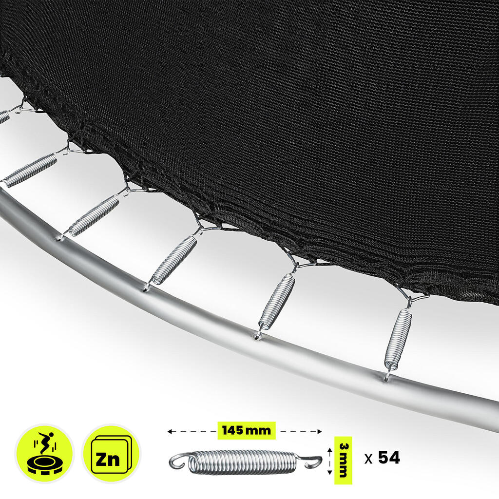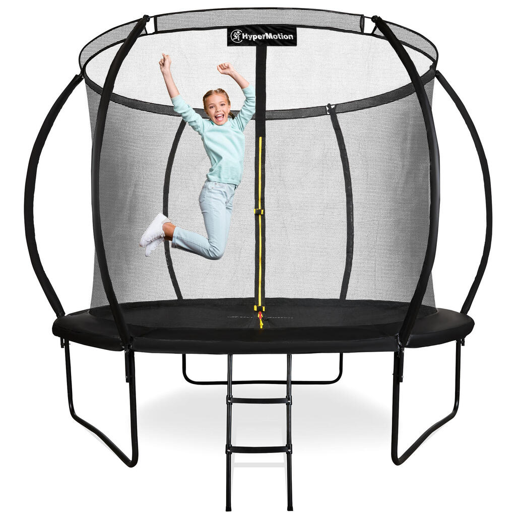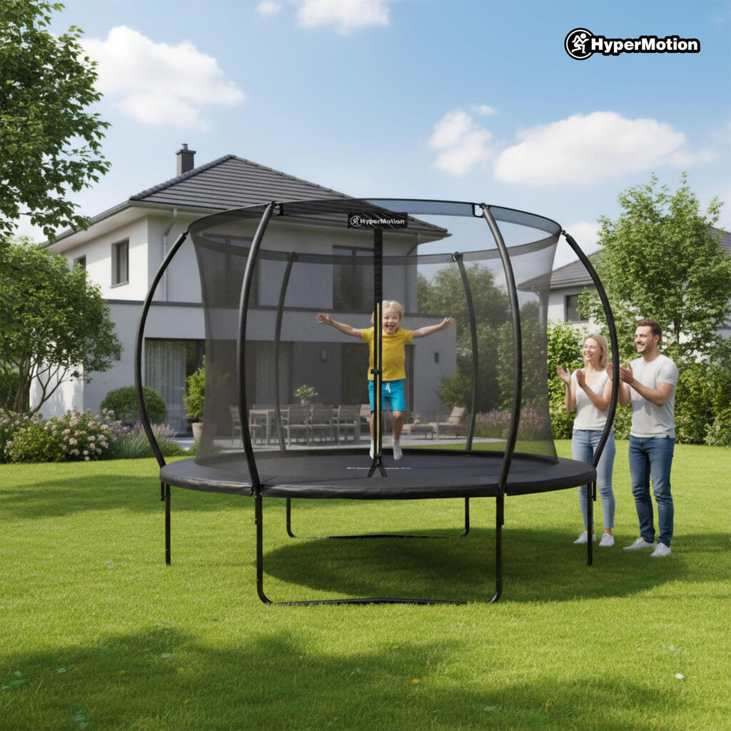 Hypermotion 10FT Garden Trampoline. 3 double legs, 54 springs & 100kg load. Net + ladder included. UV-resistant & quick-dry. EN71-14 safety.