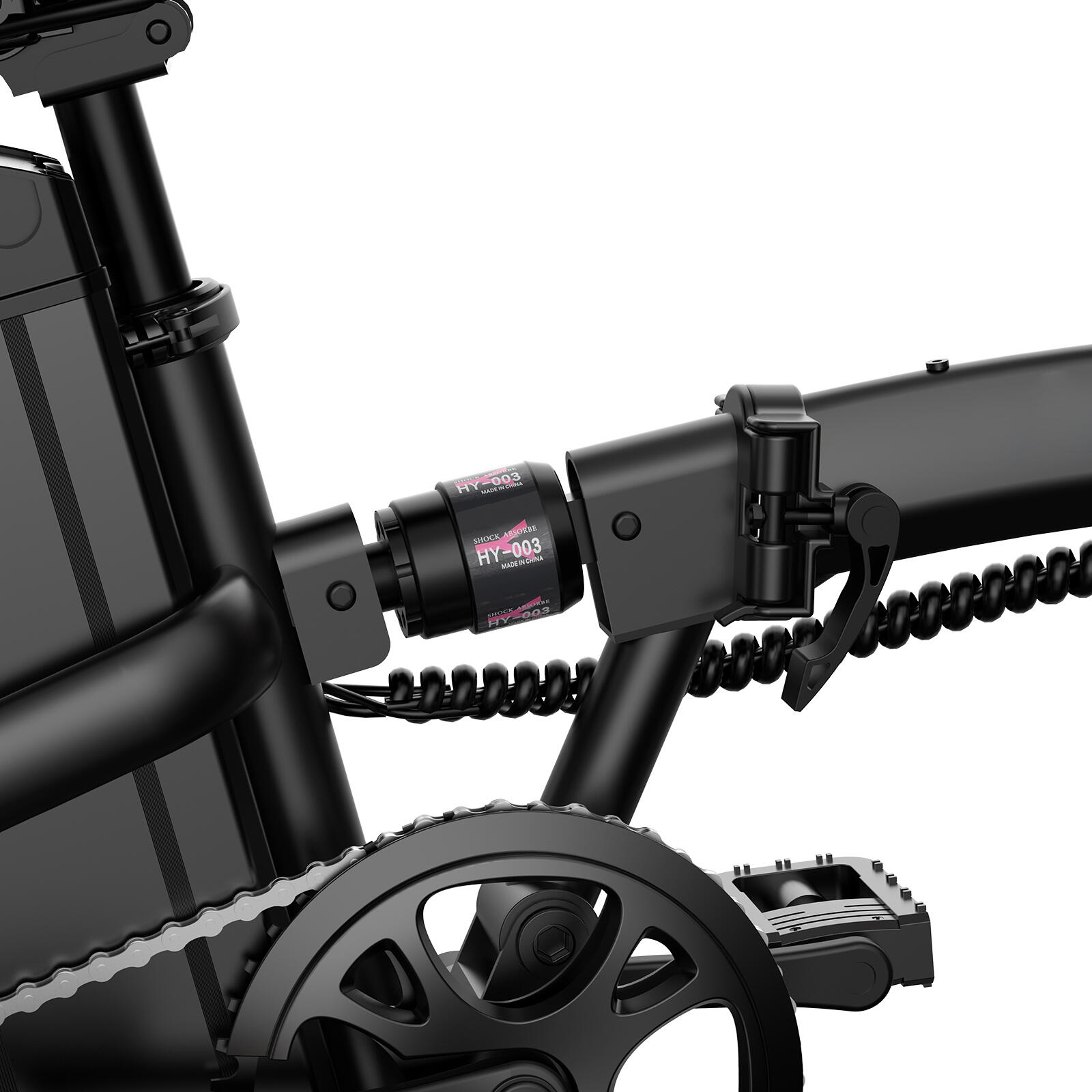 Enjoy a remarkably smooth ride on any urban surface. The dual suspension folding ebike system, combining a front fork and a mid-frame shock absorber, effectively dampens bumps and vibrations from potholes and uneven paths, ensuring superior comfort and control during your daily commute or weekend adventure.