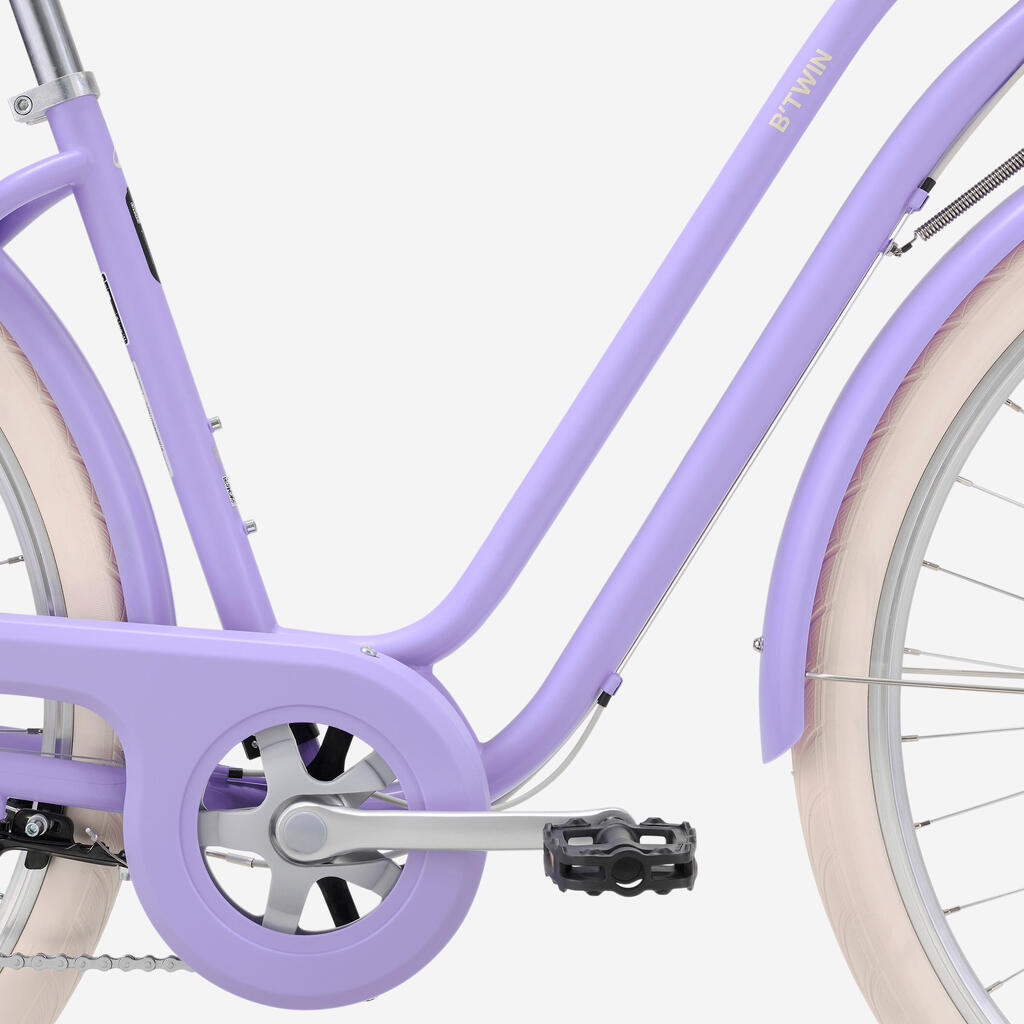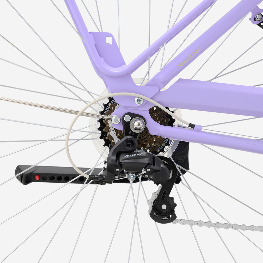 BTwin by Microshift 6-speed drivetrain. 40-tooth single chainring crankset, 170 mm steel cranks, 6-speed 14x28 freewheel, rust-resistant KMC chain. 6-speed BTwin by Microshift grip shifter. Development: 3.15 m to 6.29 m.
