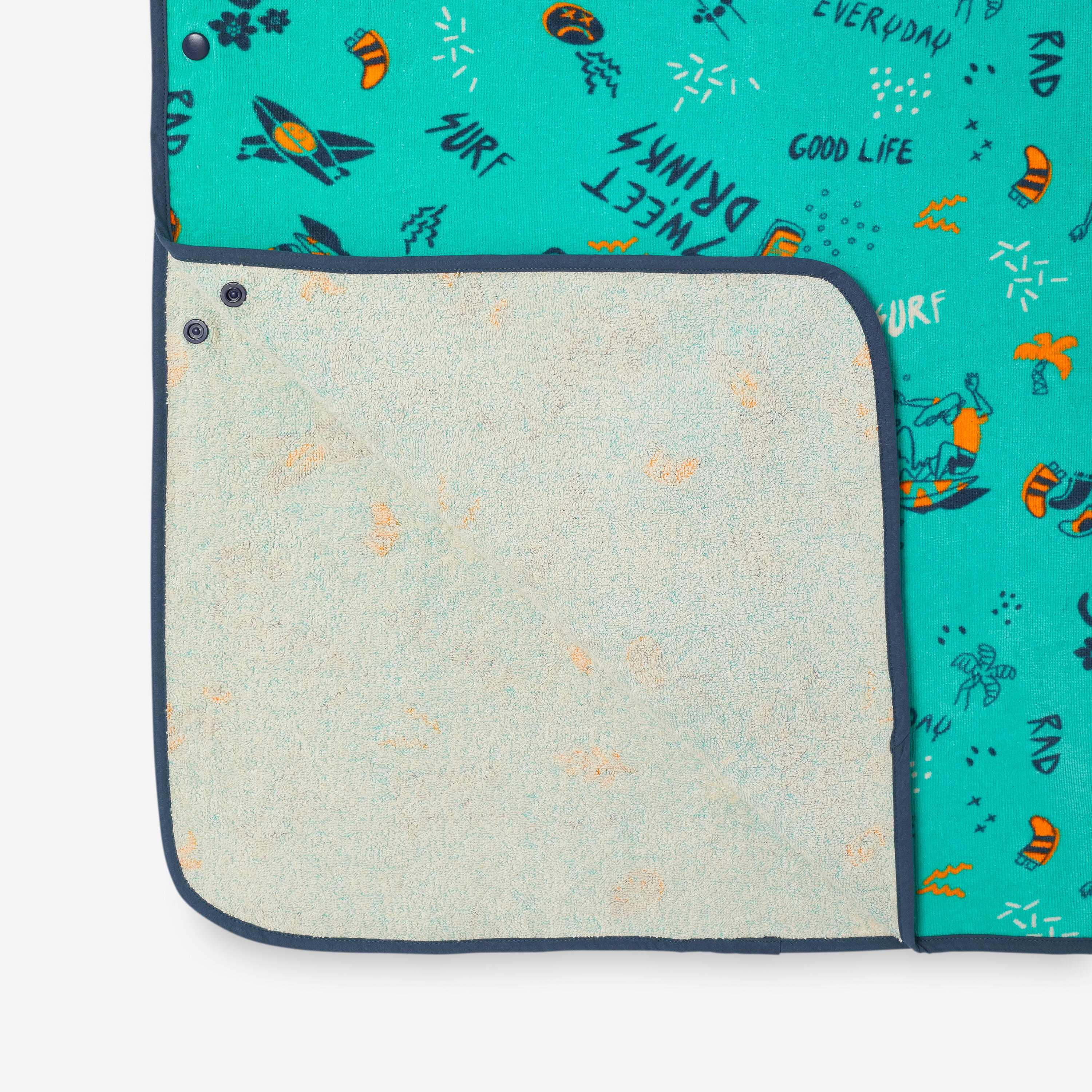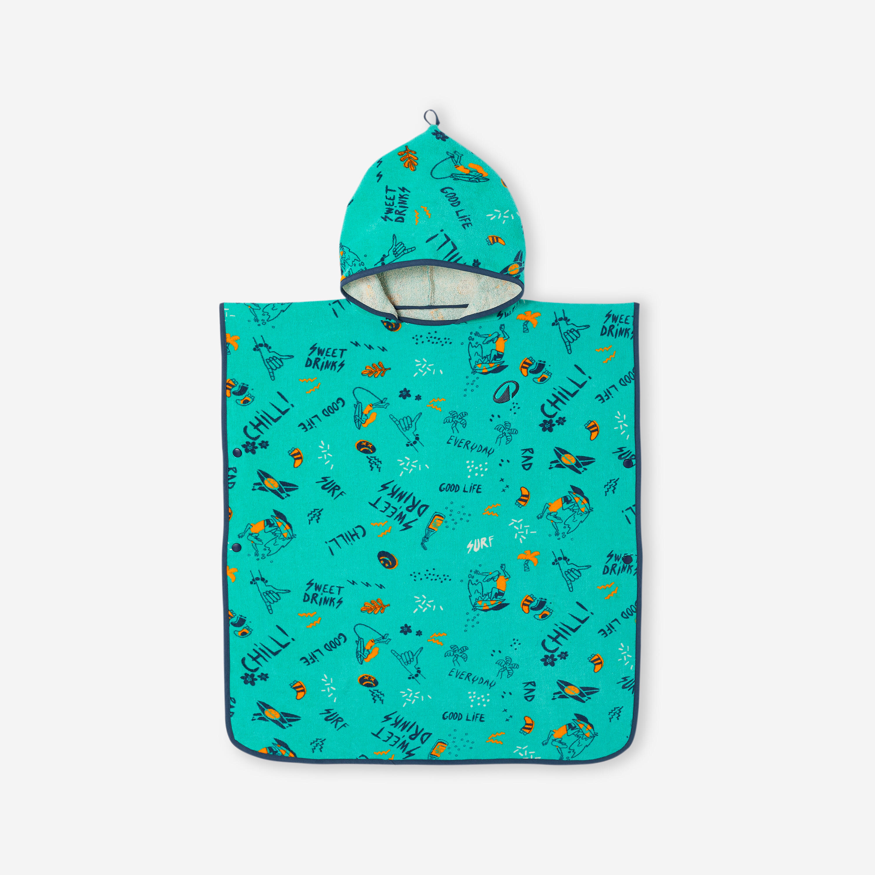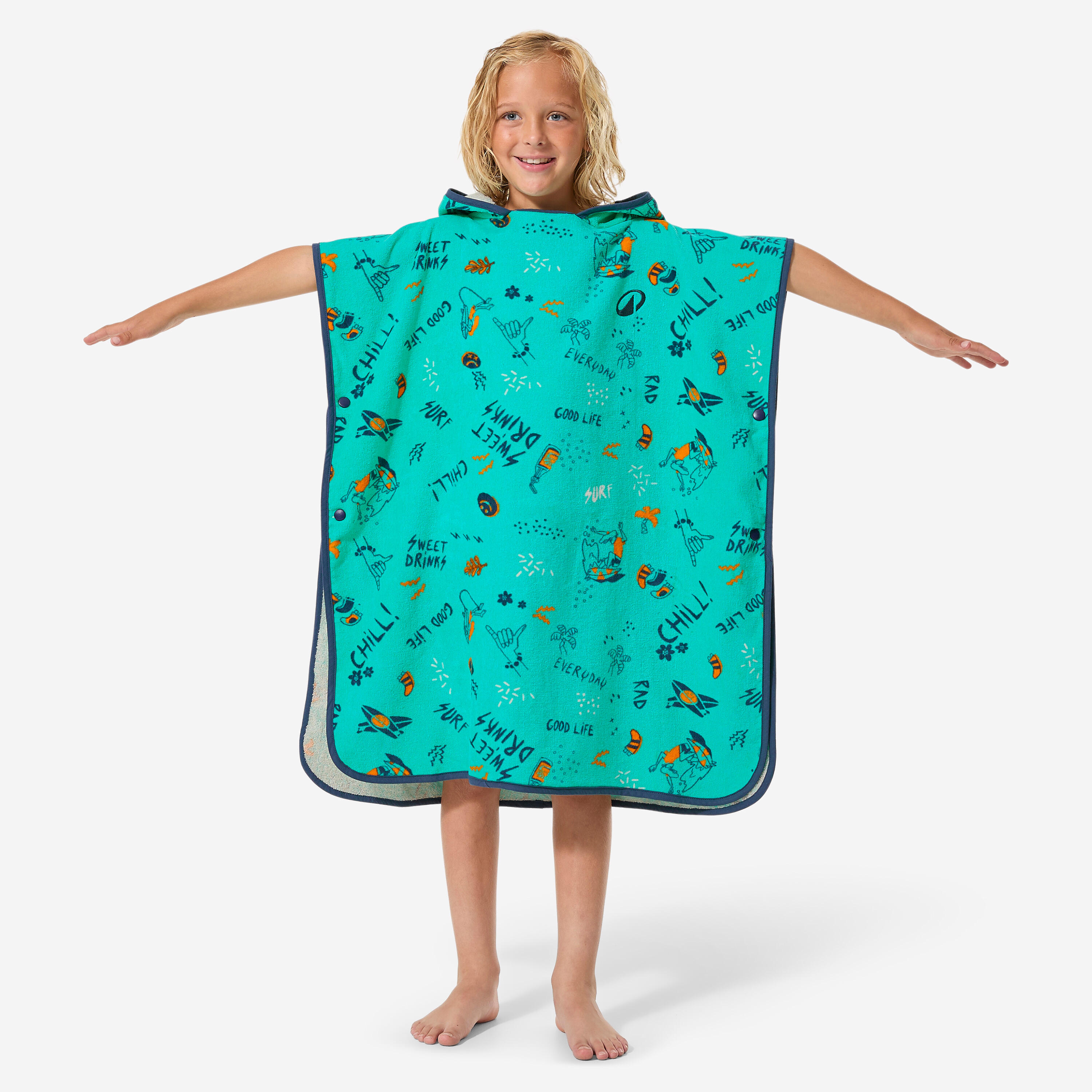 Thanks to the press studs on the sides, this poncho is very easy to use. Unbuttoned and unfolded, it becomes a practical beach towel, ideal for relaxing after surfing.