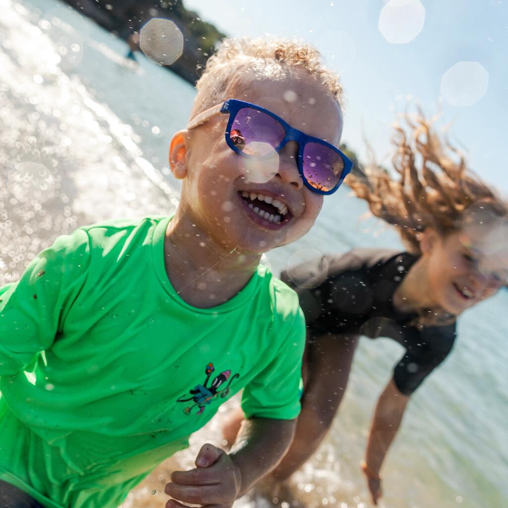 Kids' UV-resistant short-sleeved T-shirt for sun protection, even in the water, and to reduce irritation from skin coming into contact with the board. Loose cut makes it easy to put on