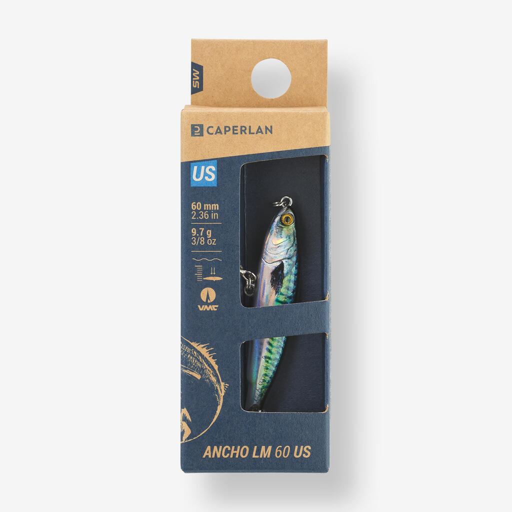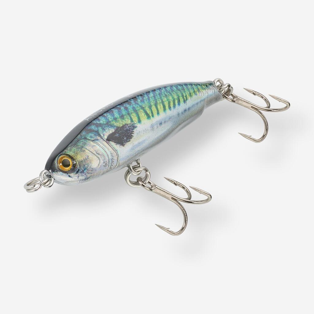 Sinking lure (lipless minnow) designed for fishing for marine predators (seabass, wolffish, scombridae, etc.) with long-distance casting/retrieving techniques.
