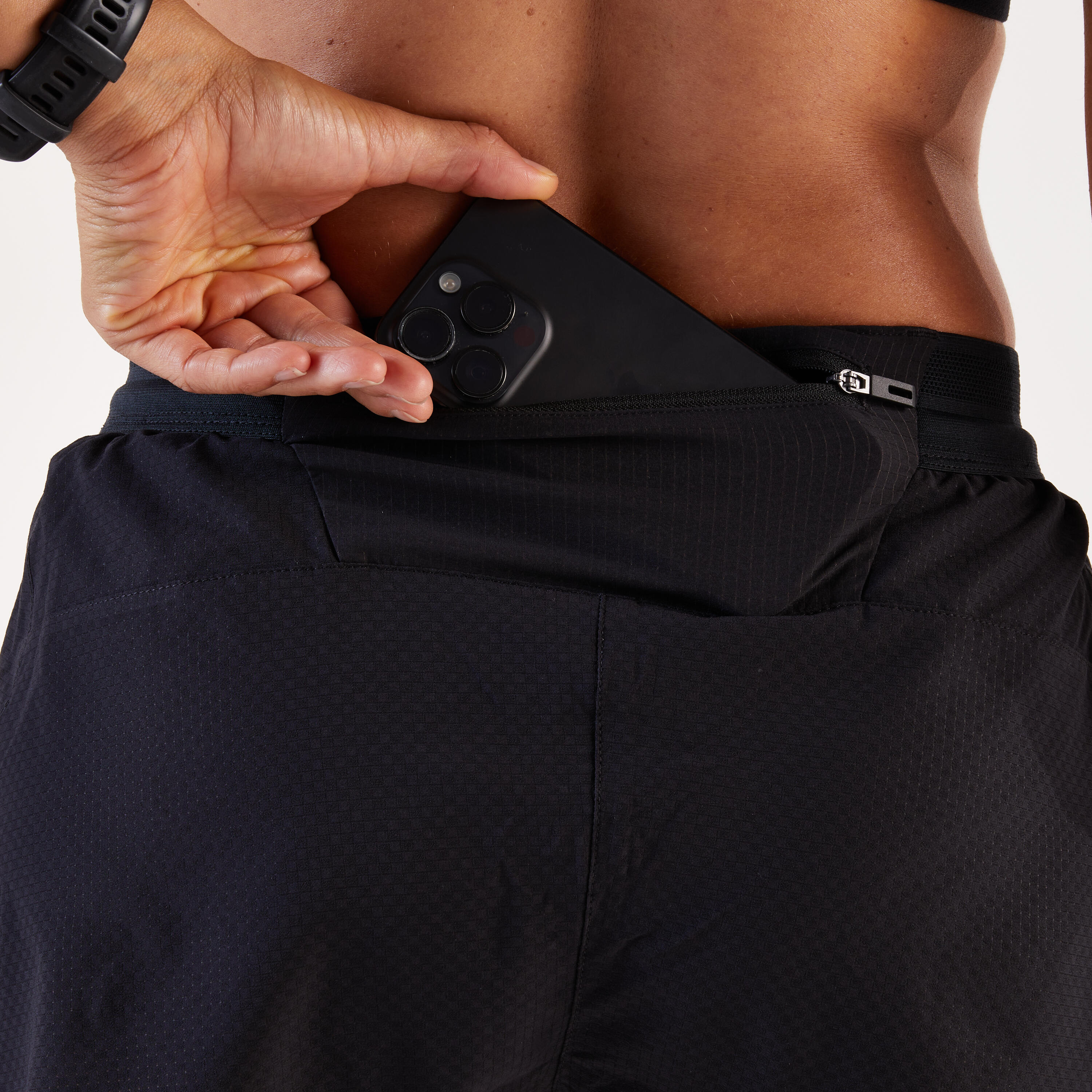 Its short, tailored cut with built-in pants provide a feeling of freedom! Carry your running essentials with you (gels, keys) in the two pockets.