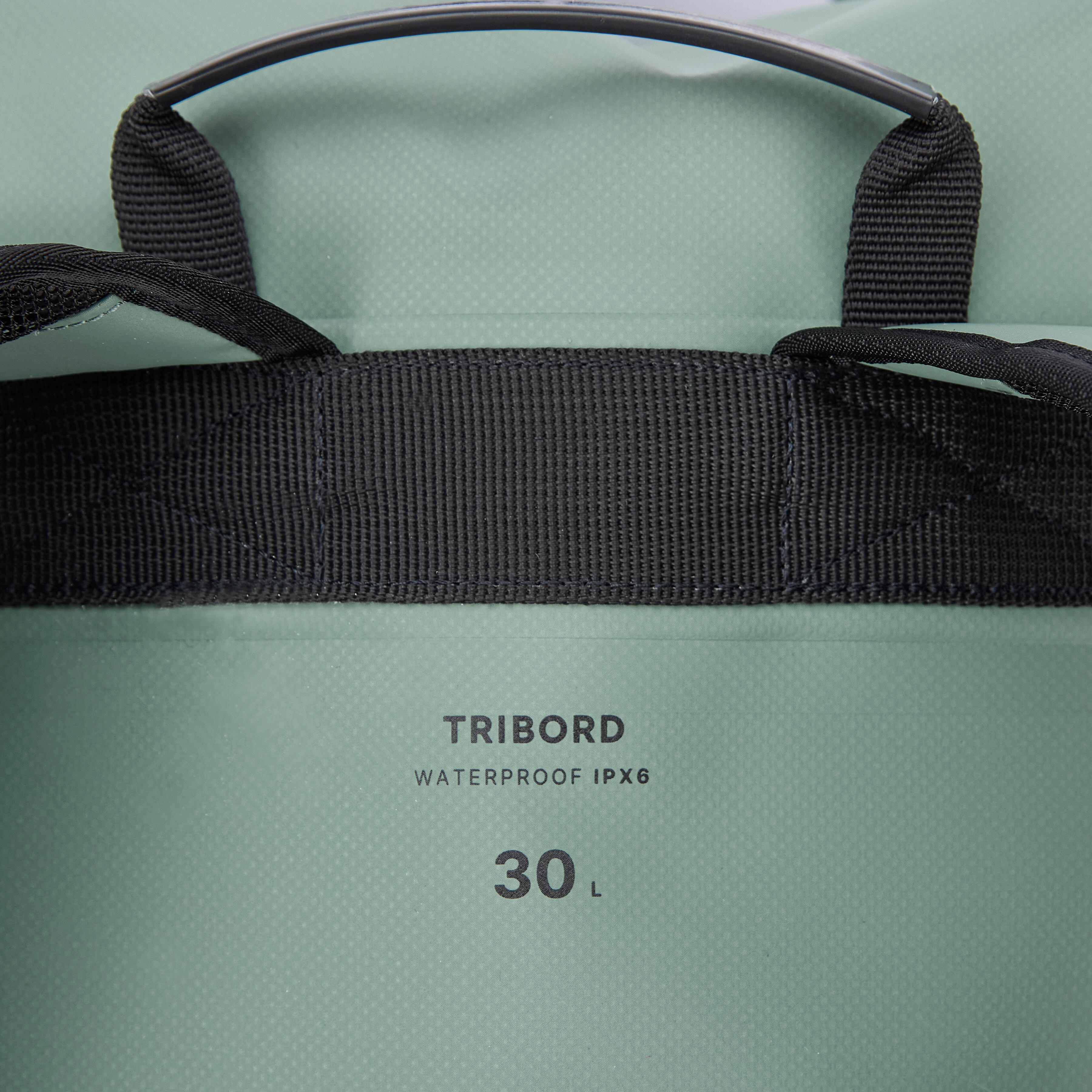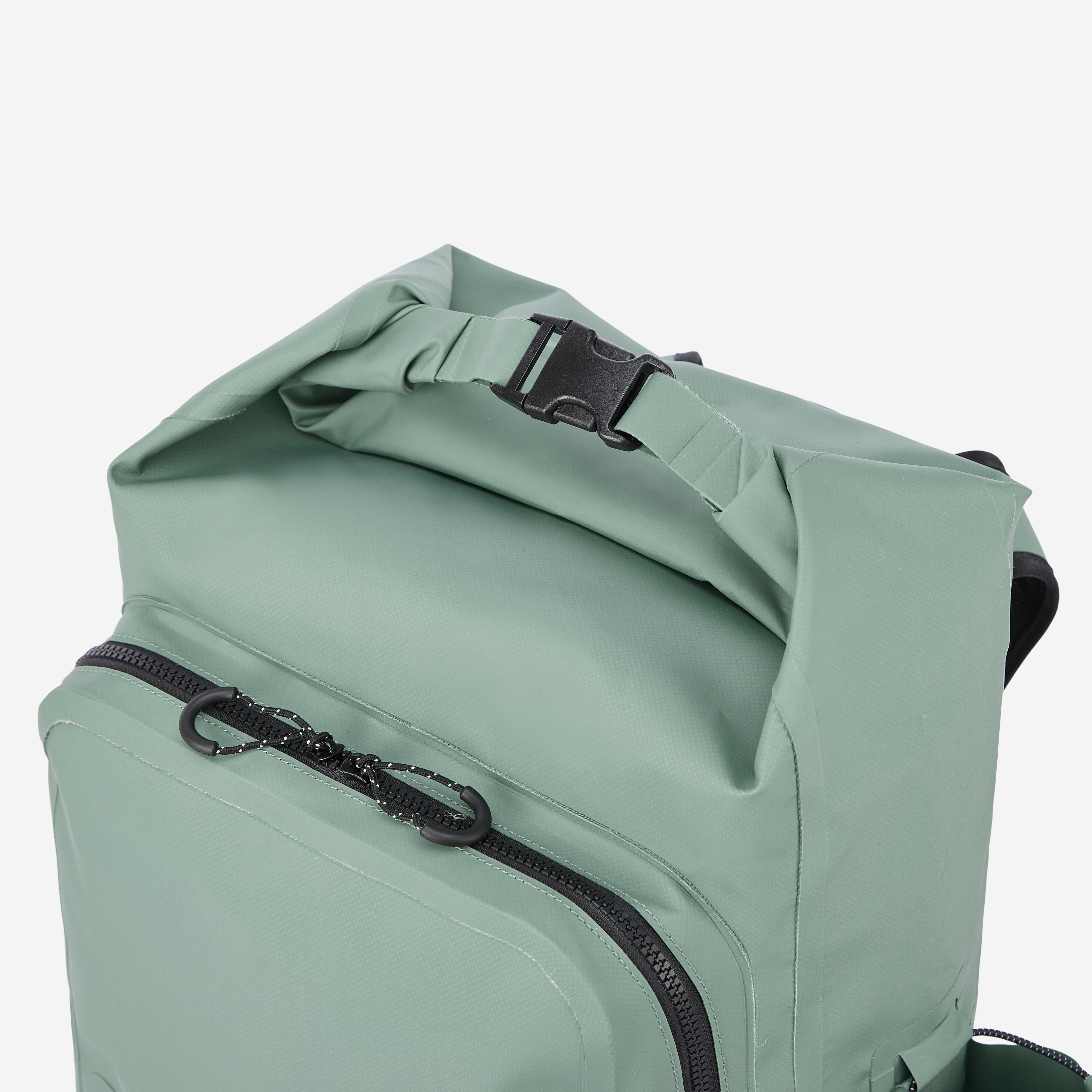 Double compartment backpack: IPX6 waterproof main compartment over 20 litres with roll top, 10-litre zipped secondary compartment, side pockets and elastic gear loop.