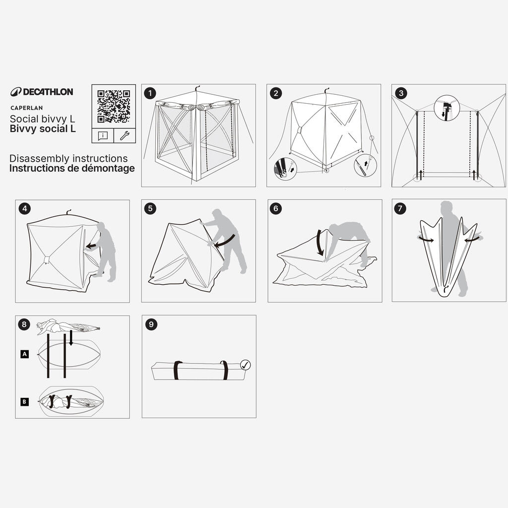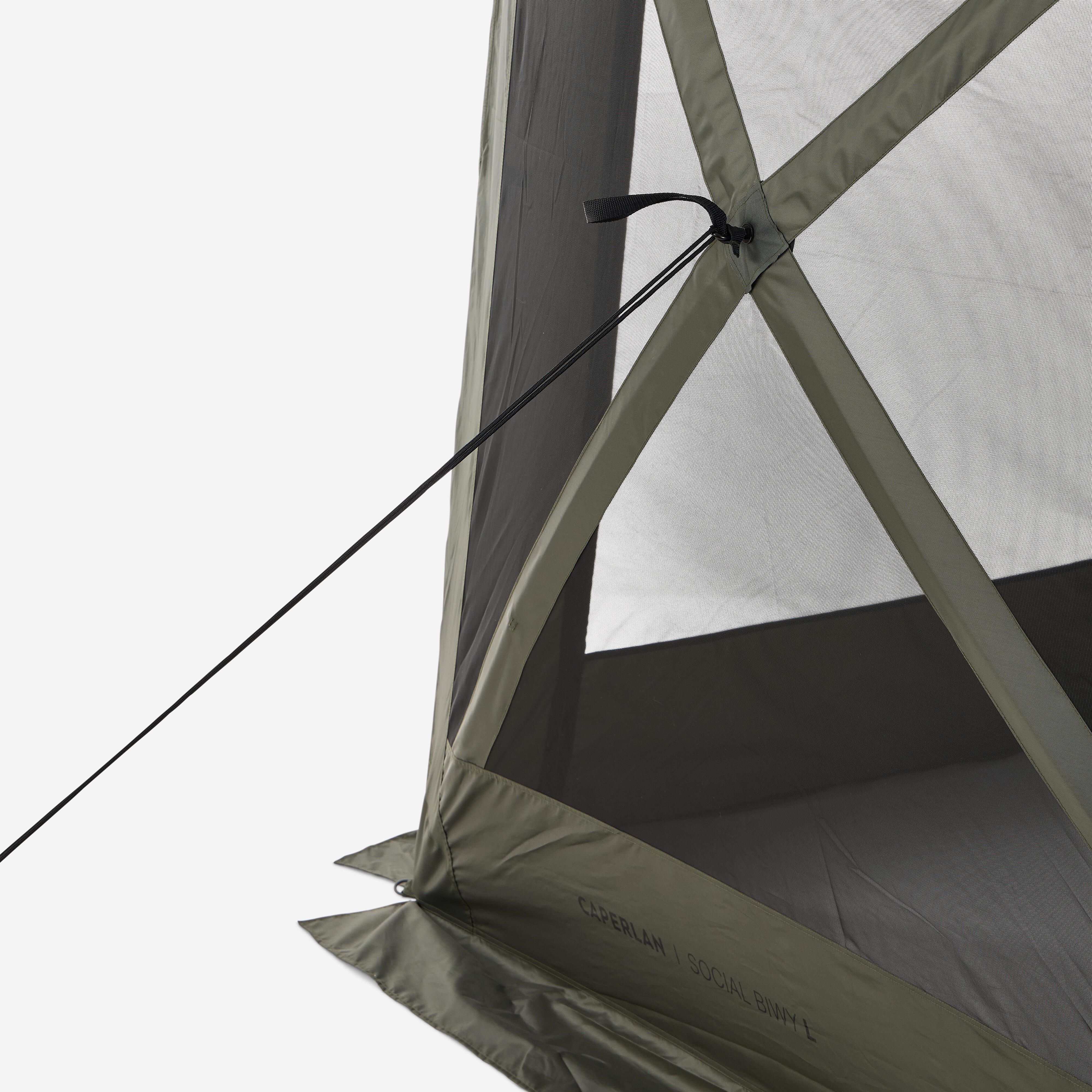 The Social Bivvy panels are fully modular to adapt to all conditions. Use them in mosquito net mode for more light and ventilation, or in tarpaulin mode for efficient protection against rain. The zipped front door can be closed or removed to create a wide opening. With the awning kit, you can create an outdoor extension sheltered from the sun and the bad weather