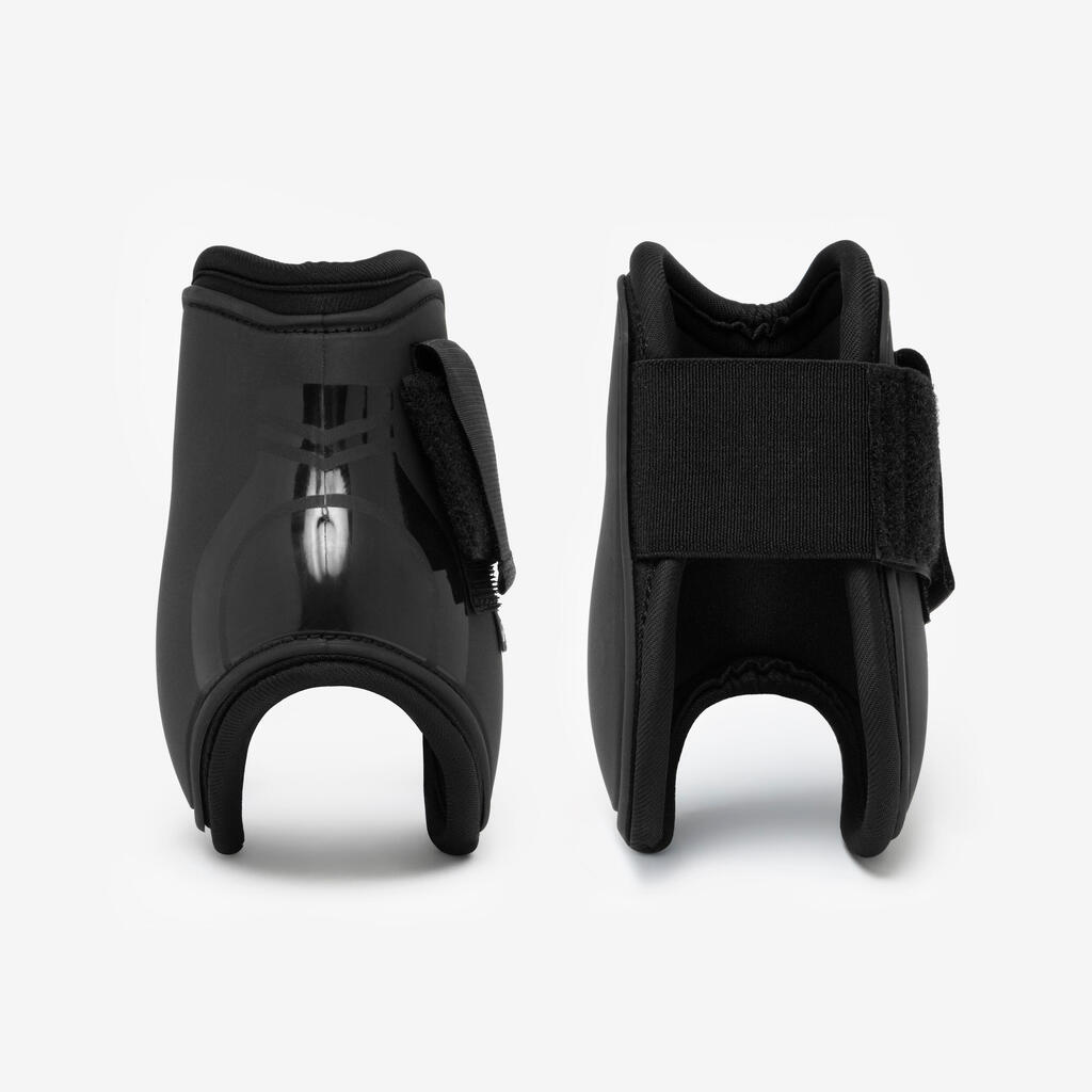 These fetlock boots provide mechanical protection adapted to the horse's hind limbs during work. Their design limits chafing and impacts that can occur between limbs during movement, particularly when jumping.