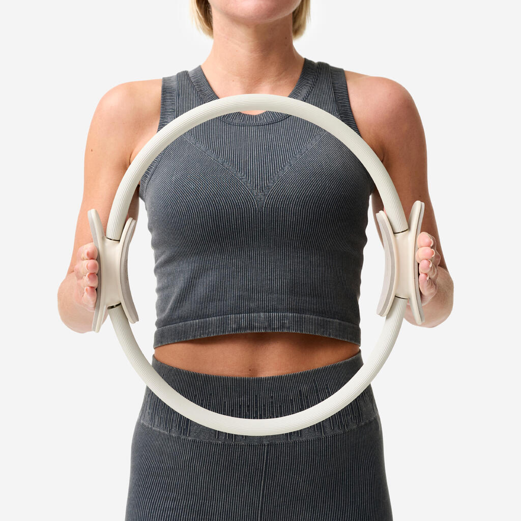 My Pilates Studio contains everything you need for a complete practise: a soft ball (ref. 8975534), a Pilates ring (ref. 8975461) and a pack of 3 glute bands (ref. 8872877) in light, medium, and heavy resistance. It's all sold with a large tote bag so you can easily carry your accessories without even needing to deflate the soft ball.