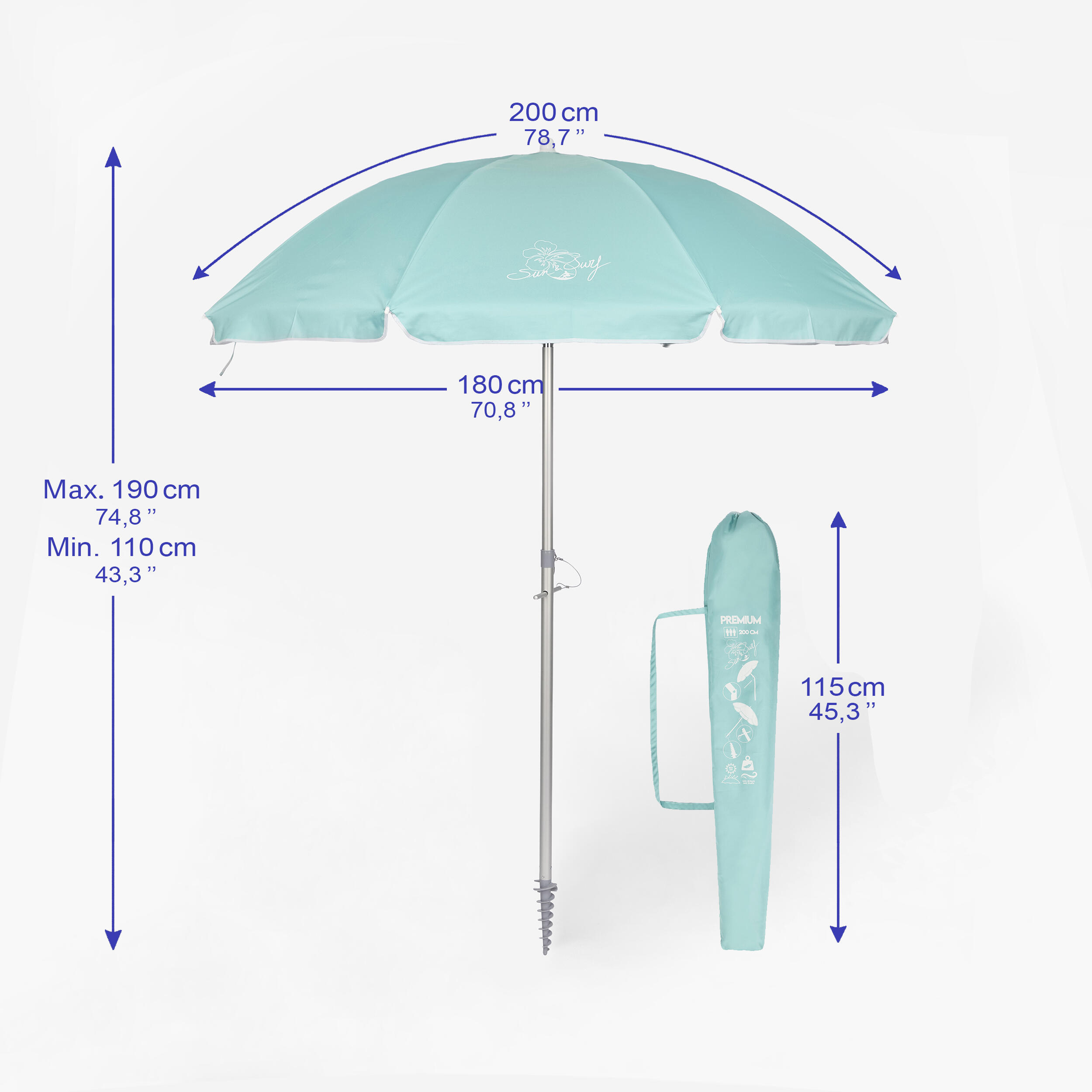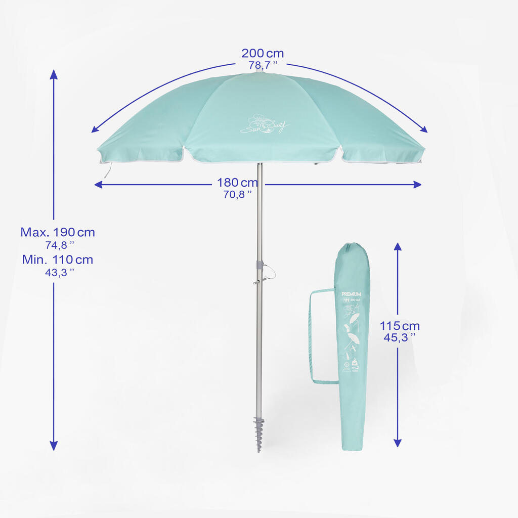 This beach umbrella includes a ground spike to anchor it securely in the sand. Thanks to its tilting mechanism, the parasol can be adjusted to follow the sun throughout the day. It provides excellent protection from glare and UV rays without needing to be moved constantly.