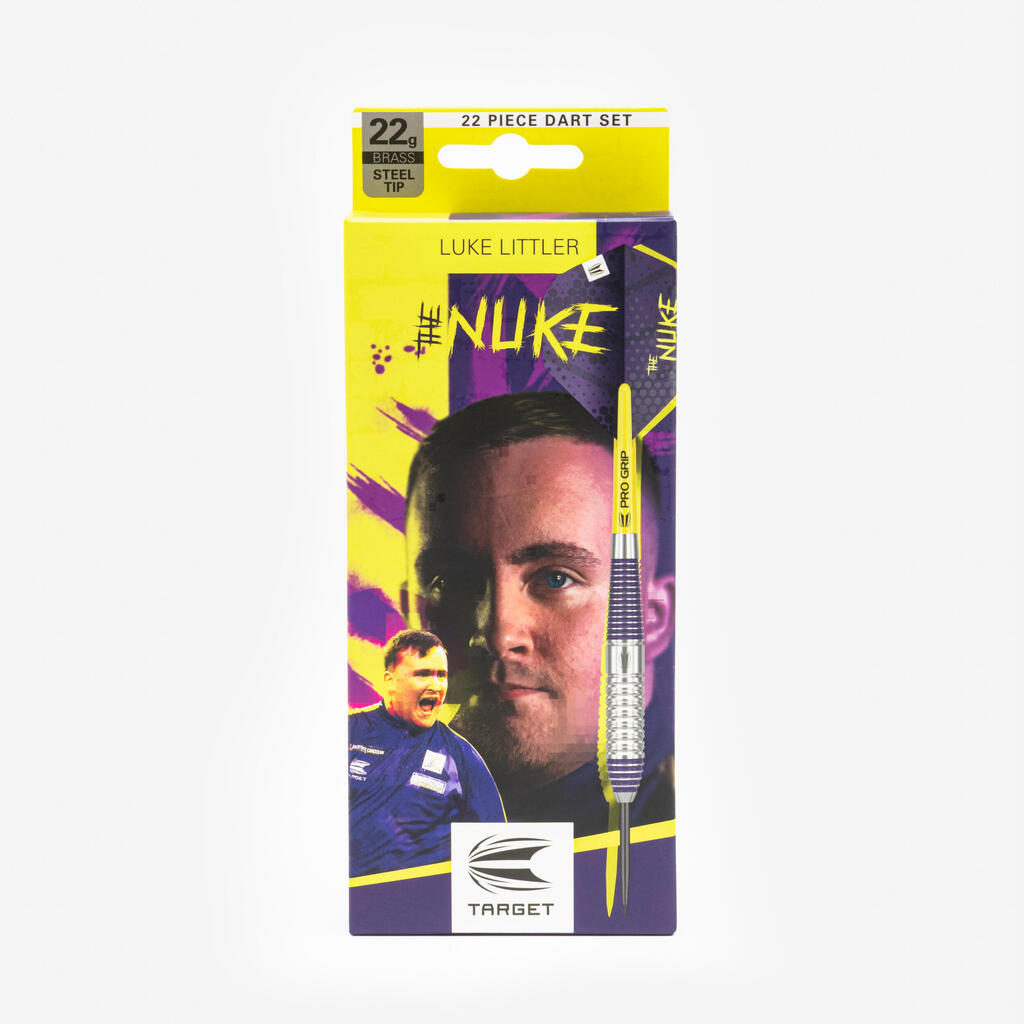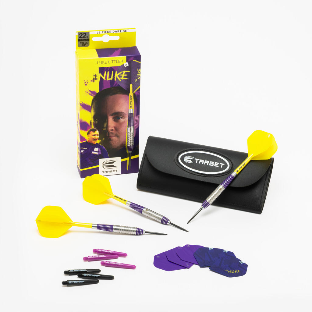 Explore this 22G brass dart set, co-developed with Luke Littler.Includes 3 barrels, 9 shafts, 9 flights and a case for a complete playing experience.