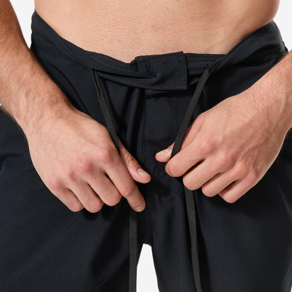 Long-cut surfing board shorts with semi-elastic waistband and button fastening.